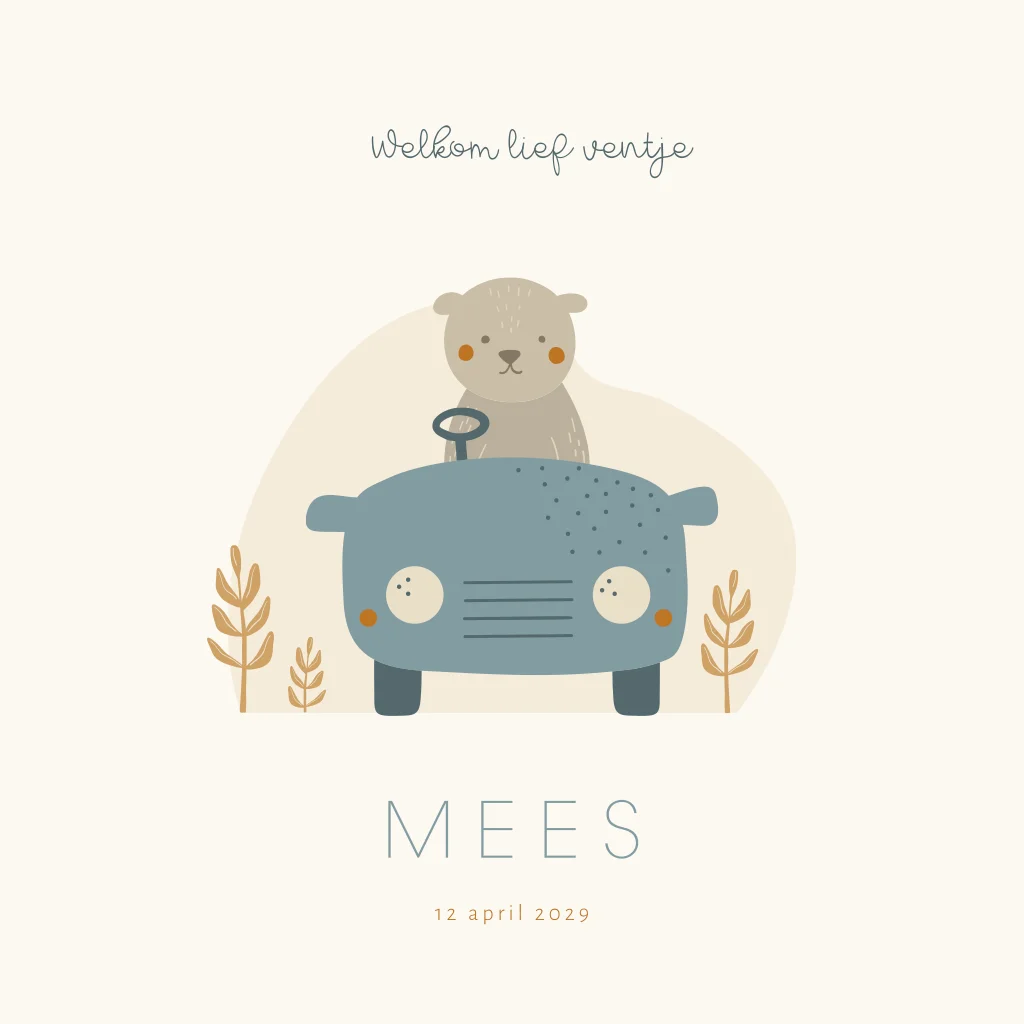 Geboortekaartje met ronde hoeken voor een zoon. Op dit jongenskaartje Mees zie je een schattig beertje rijden in een blauwe oude auto. Verder op dit kaartje een beige achtergrond met organische vorm en takjes. Maak met deze bijpassende sluitzegel het geboortekaartje helemaal af.
