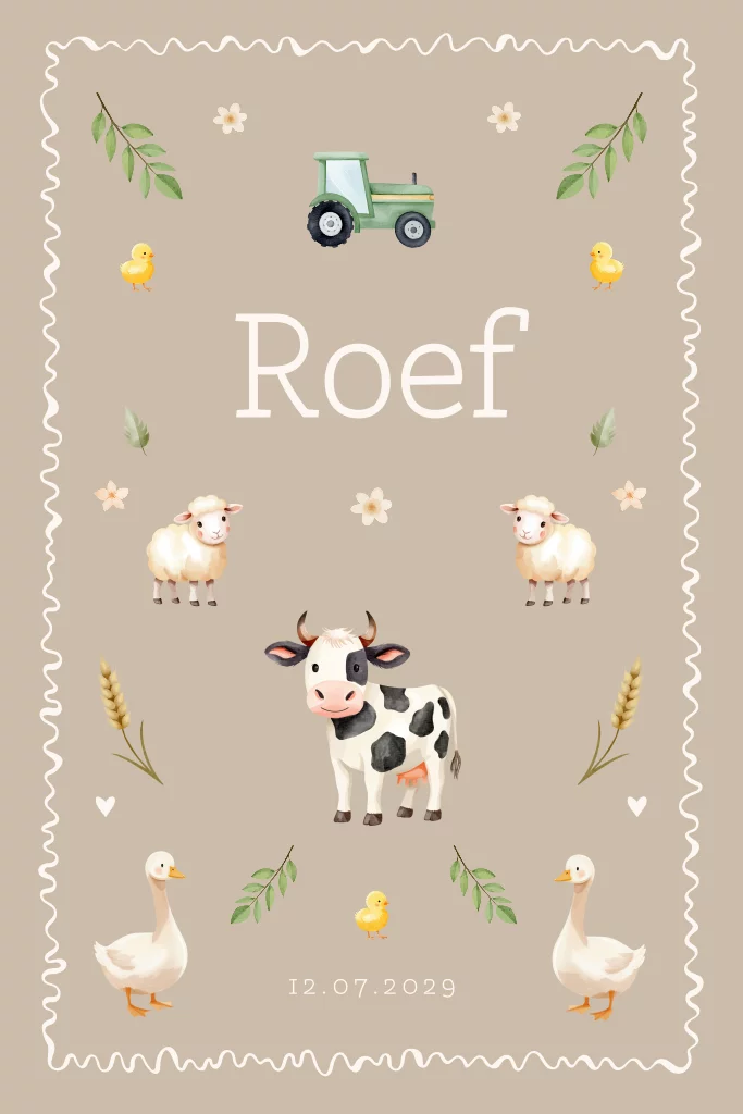 Dit geboortekaartje Roef met getekende illustraties van boerderijdieren bevat een koe, schaap, gans en kuikentje. Daarnaast zie je een golvend kader en tractor op dit kaartje. De ronde hoeken zorgen voor een speels effect. Pas dit kaartje in onze online editor aan om de geboorte van jullie zoon op een persoonlijke manier aan te kondigen. De donkergroene envelop maakt het helemaal af.