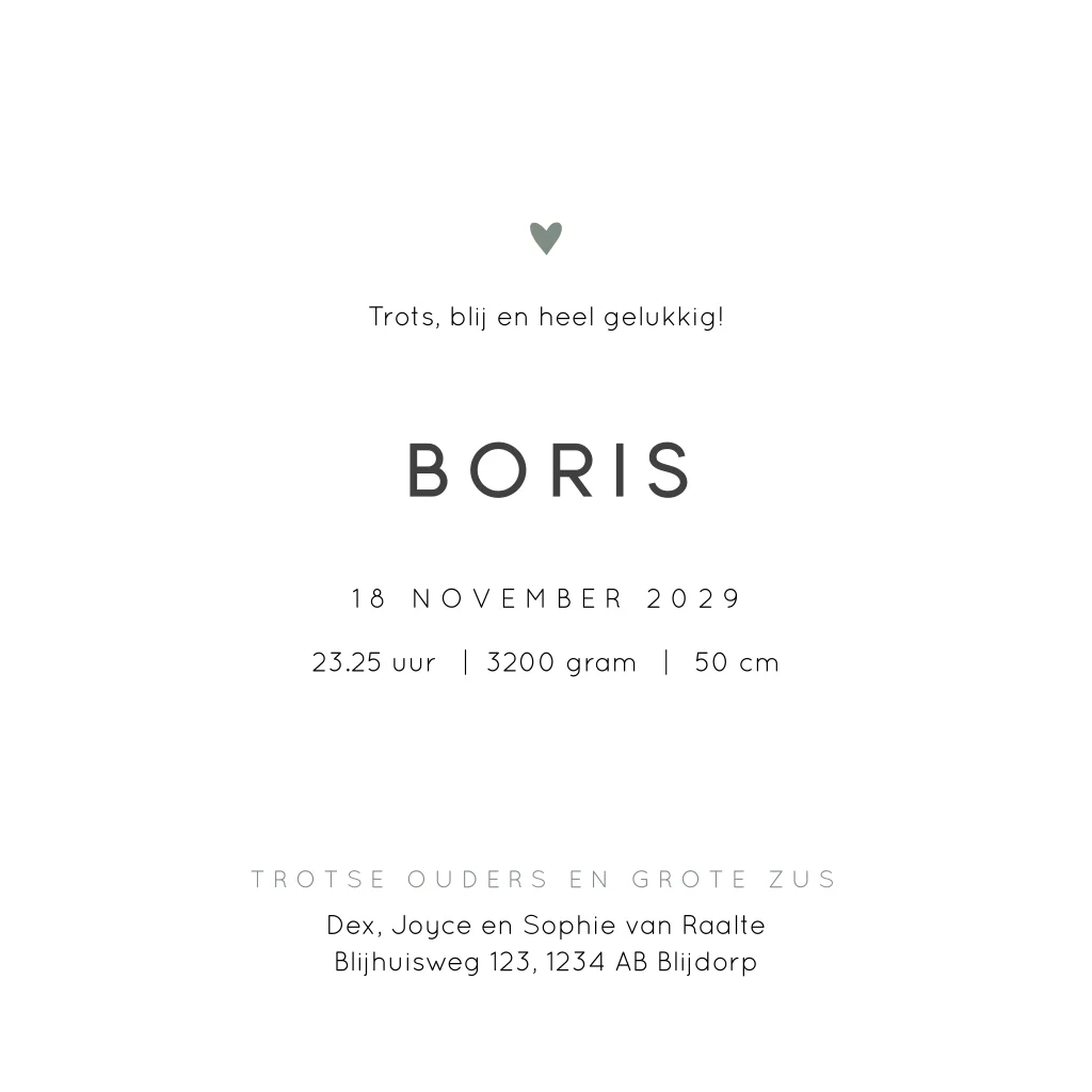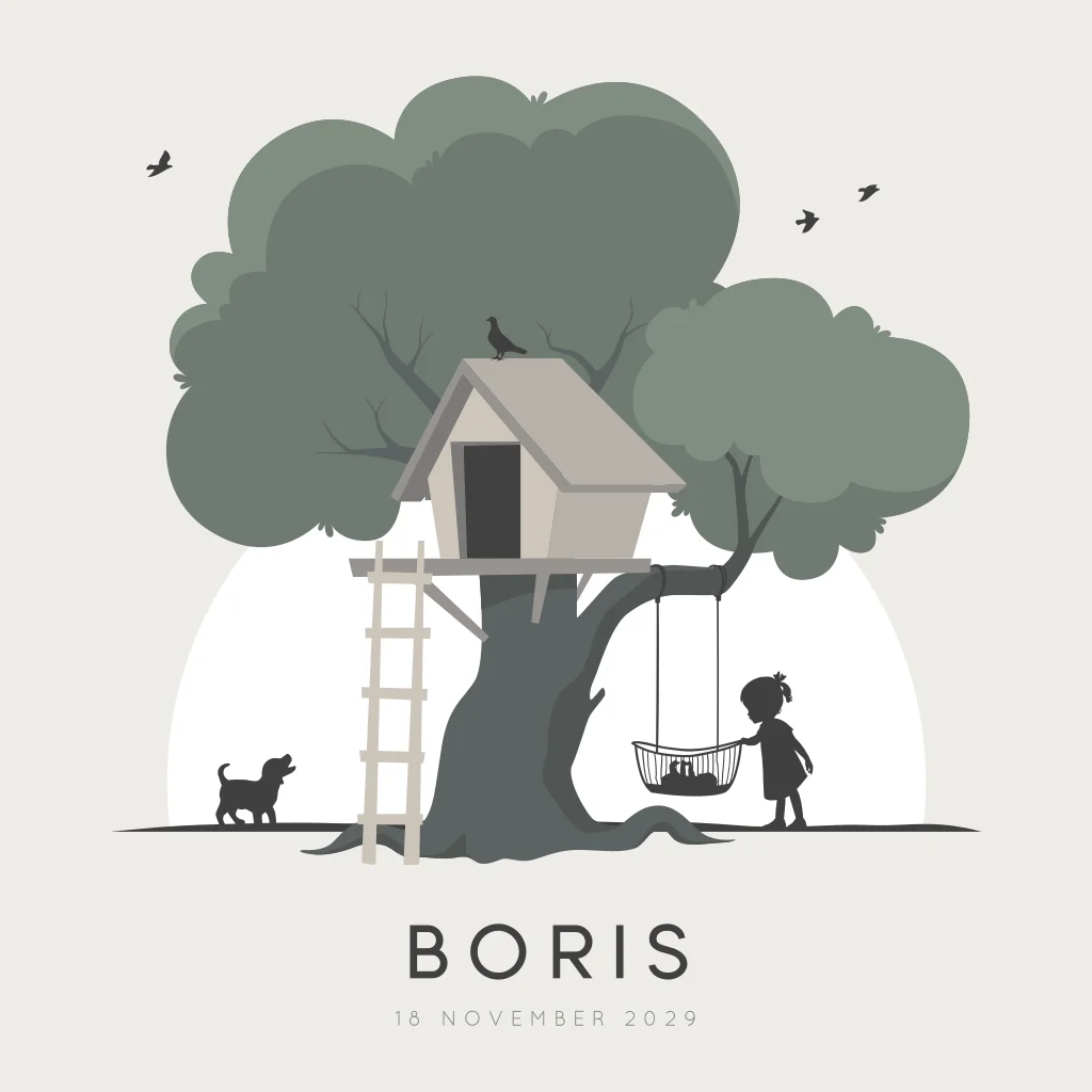 Geboortekaartje voor een zoon met een origineel ontwerp. Op dit jongenskaartje Boris een grote boom met een boomhut, de droom van ieder kind! Aan de boom hangt een wiegje met daarin een baby broertje, de grote zus kijkt in het wiegje. Verder op dit kaartje een hondje en vogels die door de lucht vliegen.