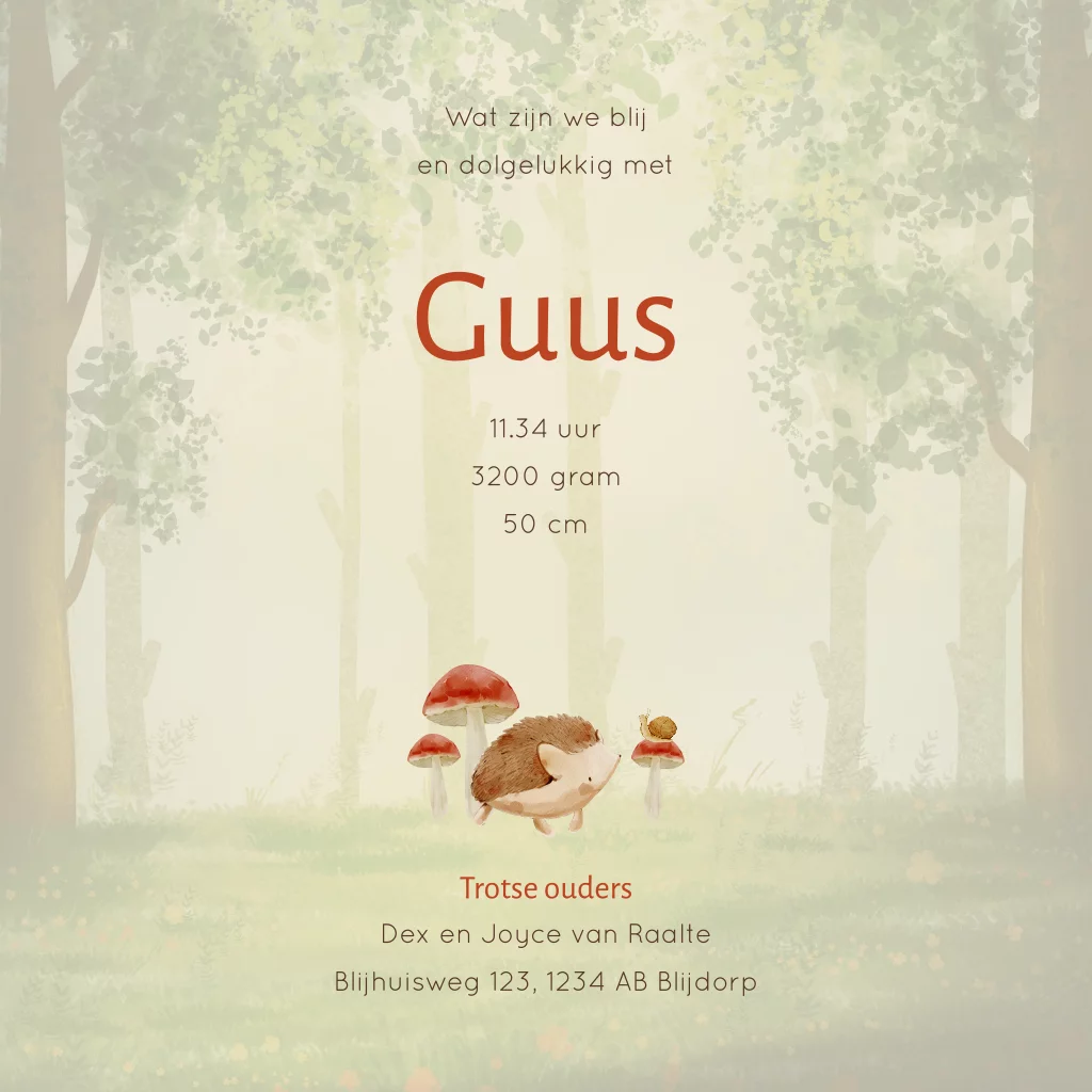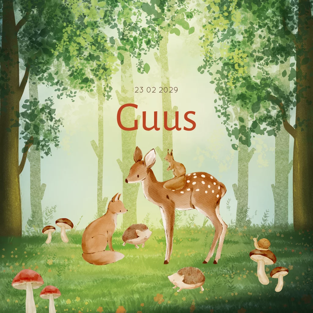 Geboortekaartje voor een jongen met verschillende bosdieren in het bos. Je ziet op dit jongens kaartje Guus een hertje met eekhoorn, vos en egeltjes. Dit geboortekaartje heeft natuurlijke tinten groen en bruin. Op de voorgrond zie je paddenstoelen, een perfect kaartje voor een herfst baby dus! Het kaartje is naar je eigen smaak aan te passen. Ook kun je zelf bepalen of je ronde hoeken wilt.