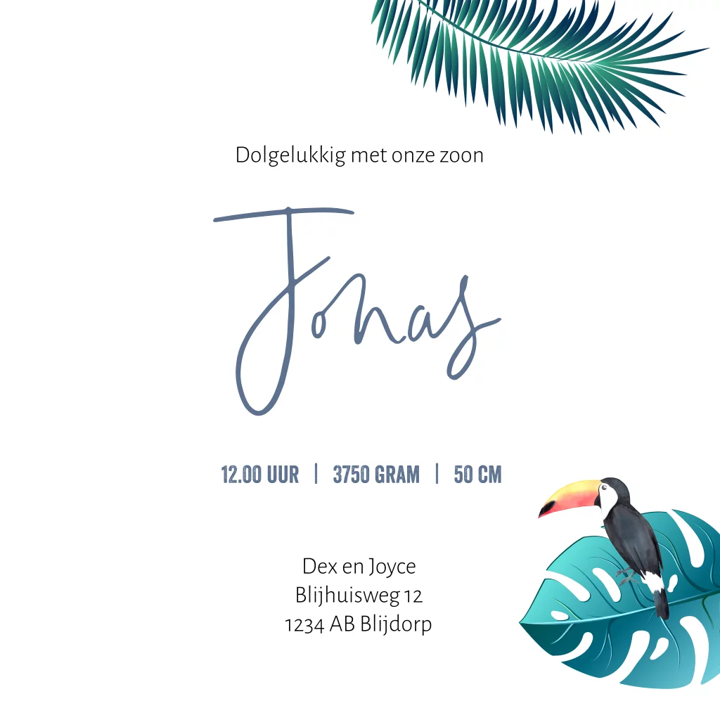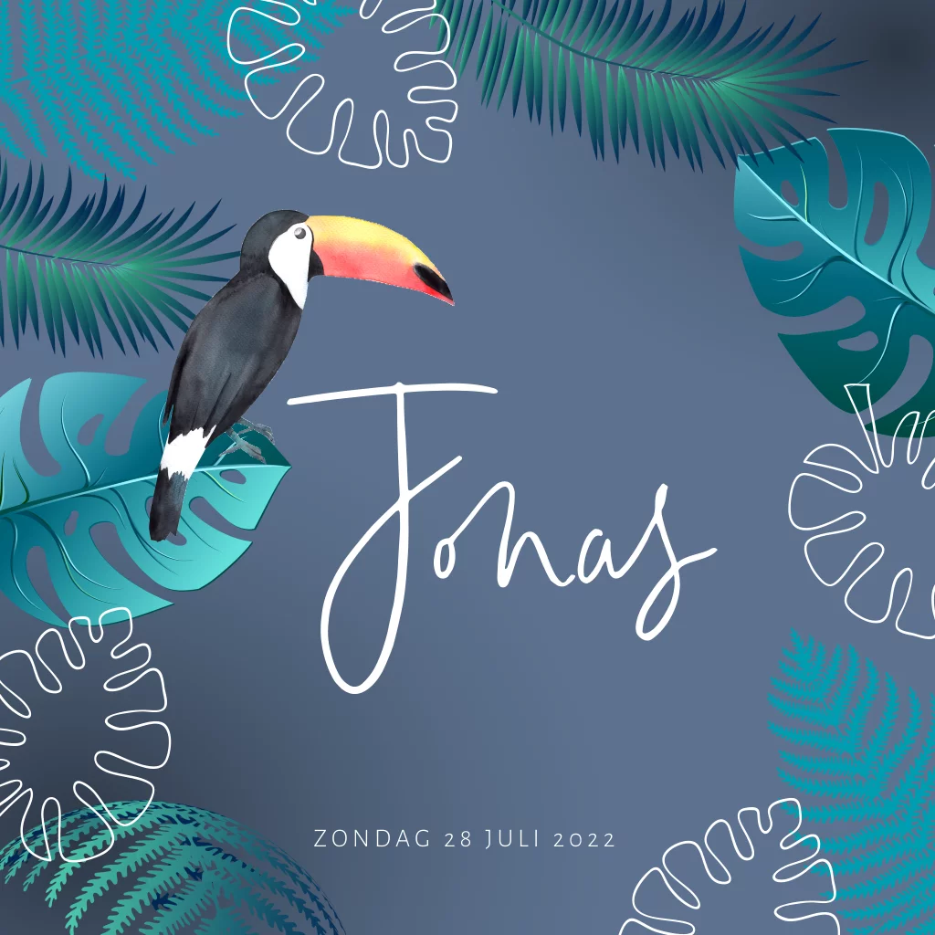 Vrolijk geboortekaartje voor een jongen in jungle stijl met botanische bladeren en een toekan. Dit kaartje Jonas heeft een donkerblauwe achtergrond met het blad in verschillende petrol tinten. De naam in het wit springt er mooi uit!