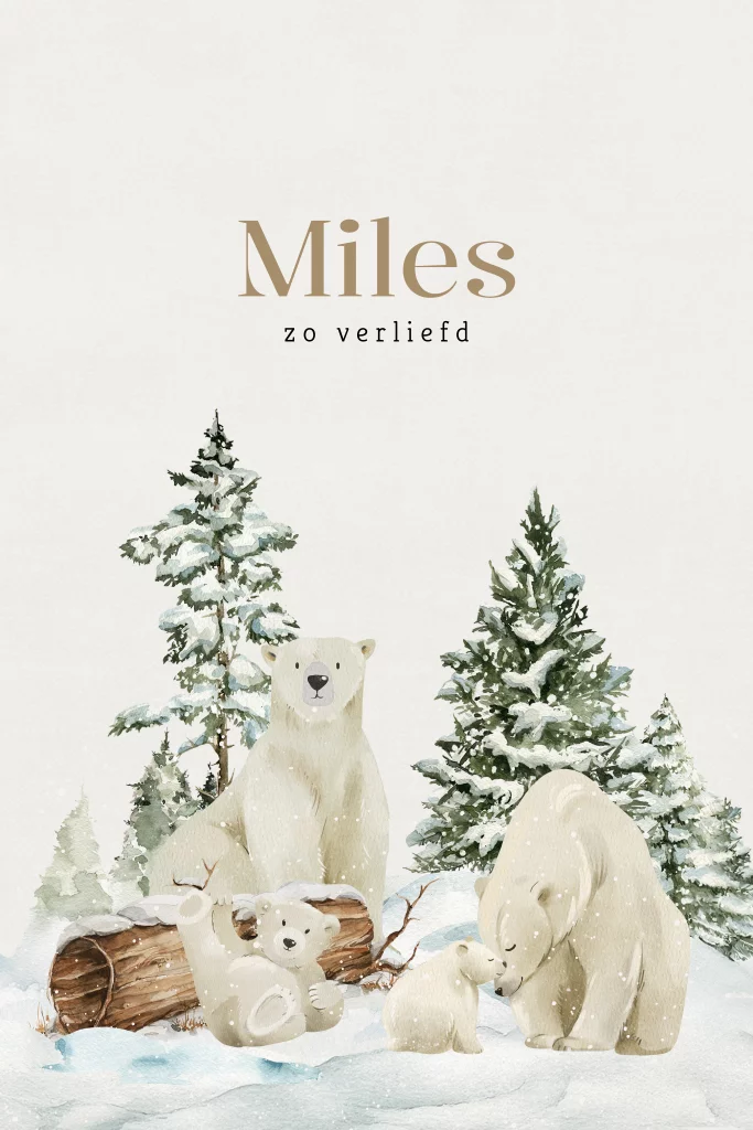 Geboortekaartje voor een tweede kindje, een broertje. Op dit jongens geboortekaartje Miles zie je een ijsberen familie in een winterlandschap. Dit geboortekaartje voor een jongen met dieren pas je zelf met een paar klikken aan. Hulp nodig? Stuur ons een berichtje.