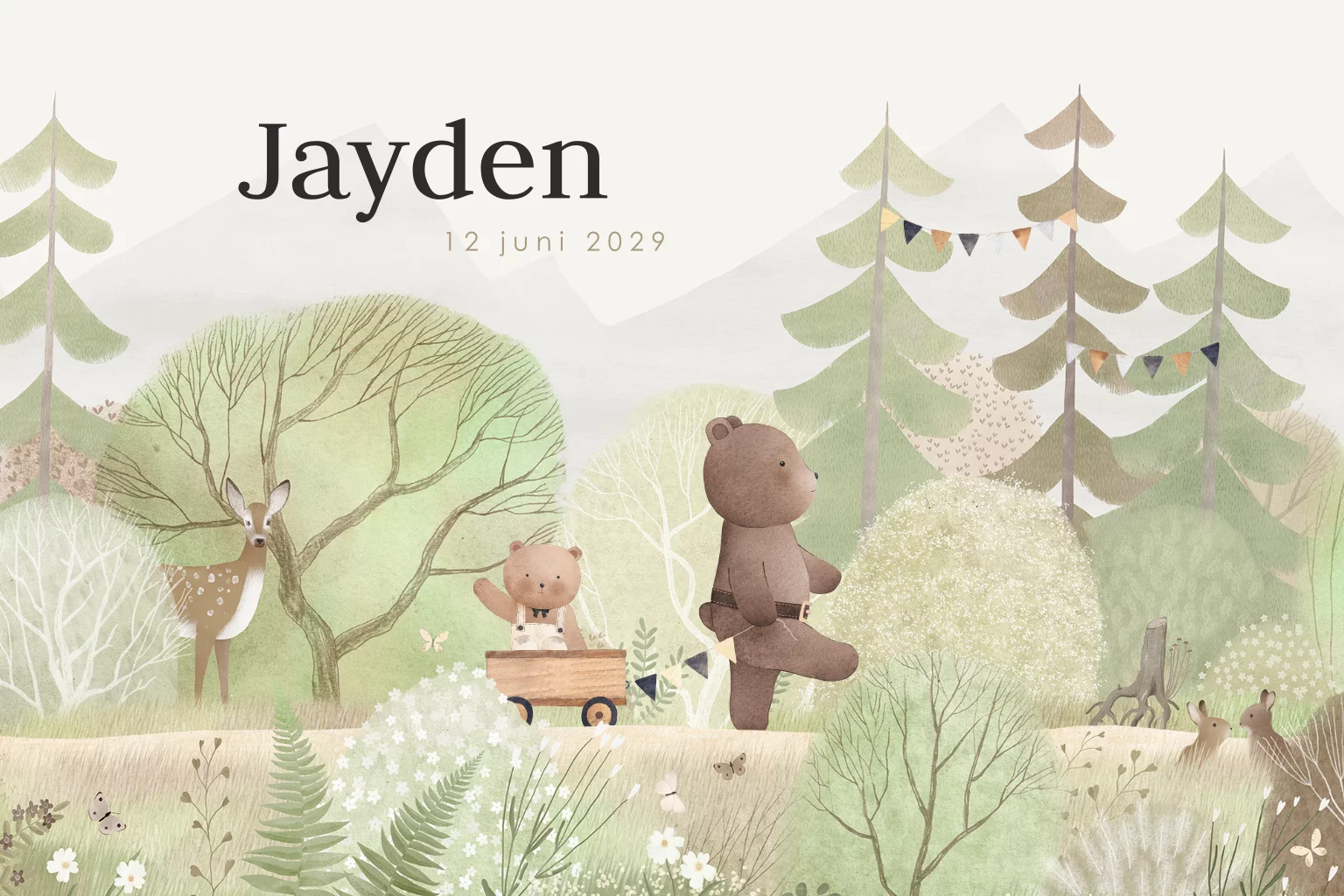 Een lief geboortekaartje voor een jongentje, tweede kindje. Dit geboortekaartje Jayden heeft een bosdieren thema en ronde hoeken. Je ziet een grote beer en een kleine beer die op pad zijn. Het kleine beertje (broertje) zit in de wagen en wordt door de grote beer vooruit getrokken. Op de achtergrond zie je een verscholen hertje, een paar konijntjes en een vlindertje. Pas dit kaartje voor jullie zoon naar eigen wens aan in de online editor.