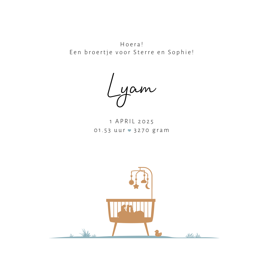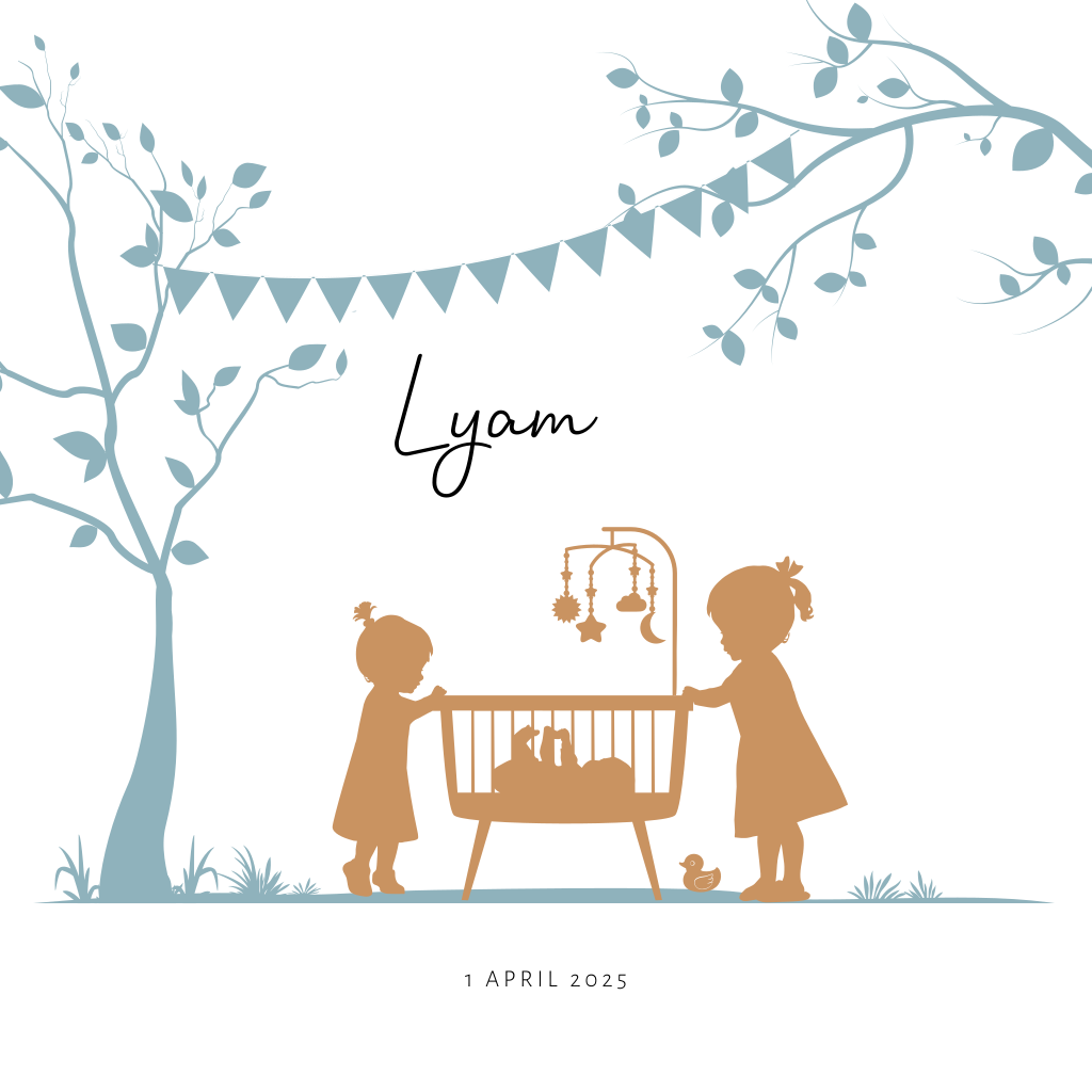 Silhouet geboortekaartje met 2 grote zussen en een klein baby broertje in een wieg. Verder op dit jongenskaartje Lyam een boom en vrolijke slingers De gebruikte kleuren zijn wit met lichtblauw en trendy camel kleur. Dit kaartje is voor een derde kindje maar ook mogelijk voor een andere gezinssamenstelling of met andere silhouetten.