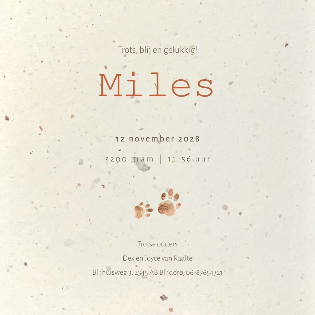 Lief duurzaam geboortekaartje voor een jongen op duurzaam Tulpenbollen papier. Op dit geboortekaartje Miles staat een illustratie van twee tijgertjes. Helemaal geschikt voor een tweede kindje dus!