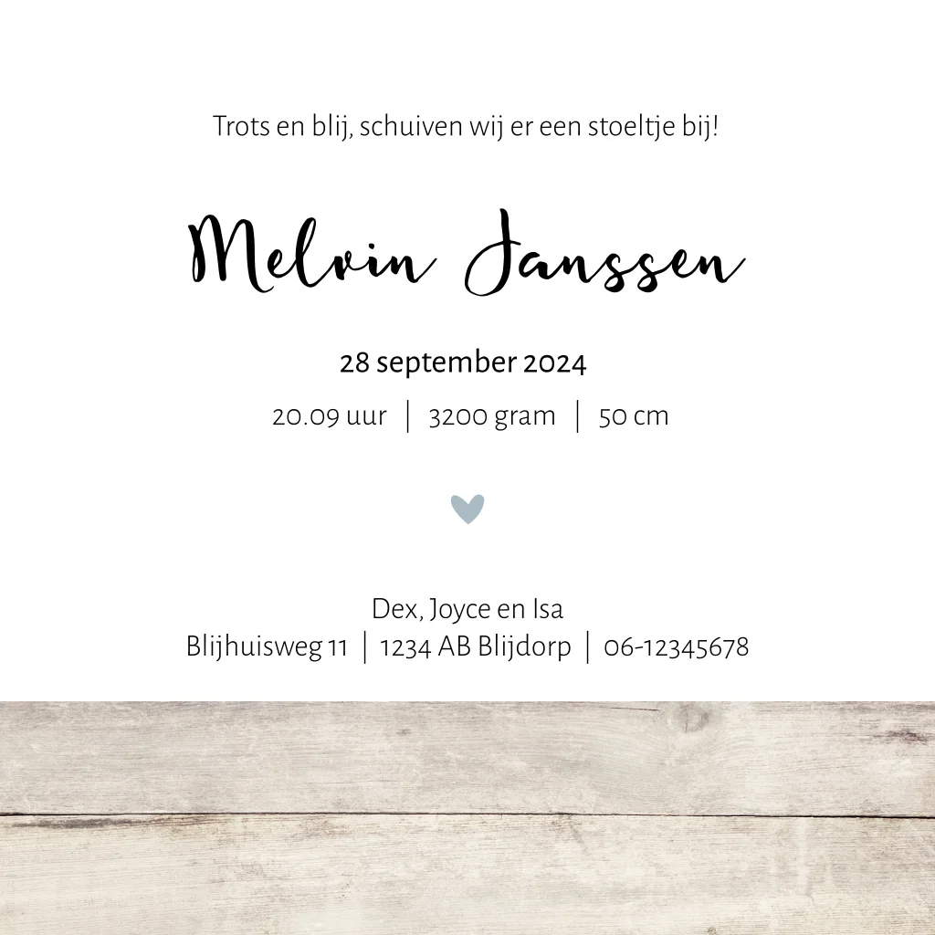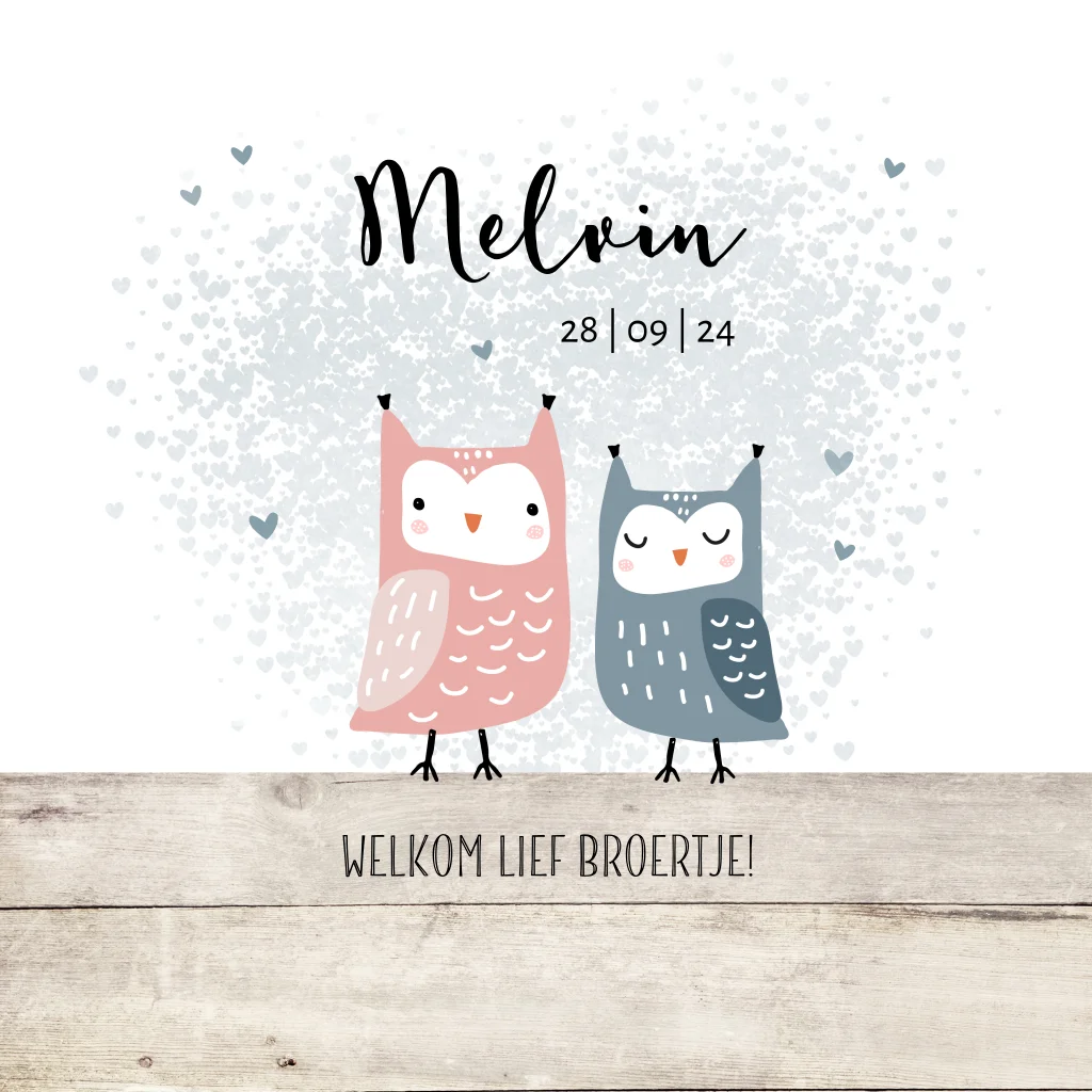Een trendy jongens geboortekaartje voor een tweede kindje. Op dit kaartje Melvin staan twee uiltjes een grote zus en een klein baby broertje. De houten rand geeft een trendy tintje. Subtiel is het grote aquarel hart dat uit allemaal kleine hartjes bestaat en als achtergrond bij de uiltjes staat.