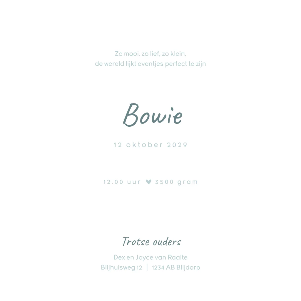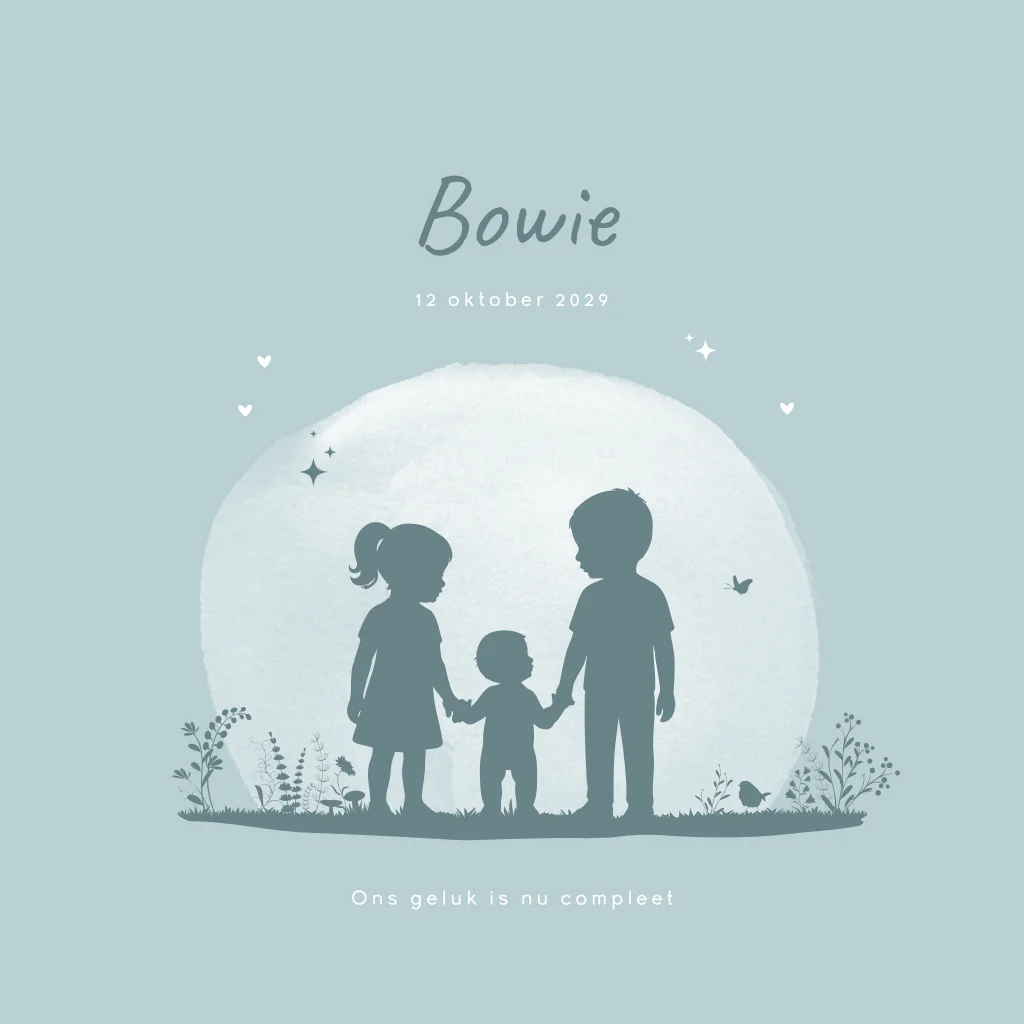 Dit geboortekaartje Bowie is ideaal voor ouders die op zoek zijn naar een silhouet ontwerp voor drie kindjes. Op dit kaartje voor jullie zoon zie je een klein broertje, grote broer en grote zus. De blauwe kleurtinten zorgen voor een dromerig effect.