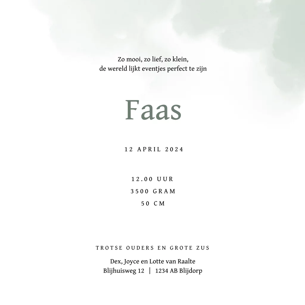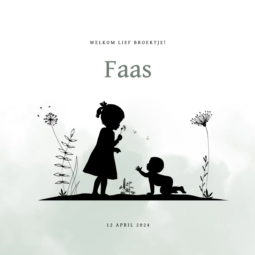Jongens geboortekaartje met het silhouet van een grote zus en een klein baby broertje tussen de mooie veldbloemen. De grote zus blaast de donzige pluisjes van een paardebloem en het kleine jongetje zit er op zijn knietjes bij. Op de achtergrond een groene aquarel. Pas dit lente kaartje Faas naar je eigen smaak aan de editor.