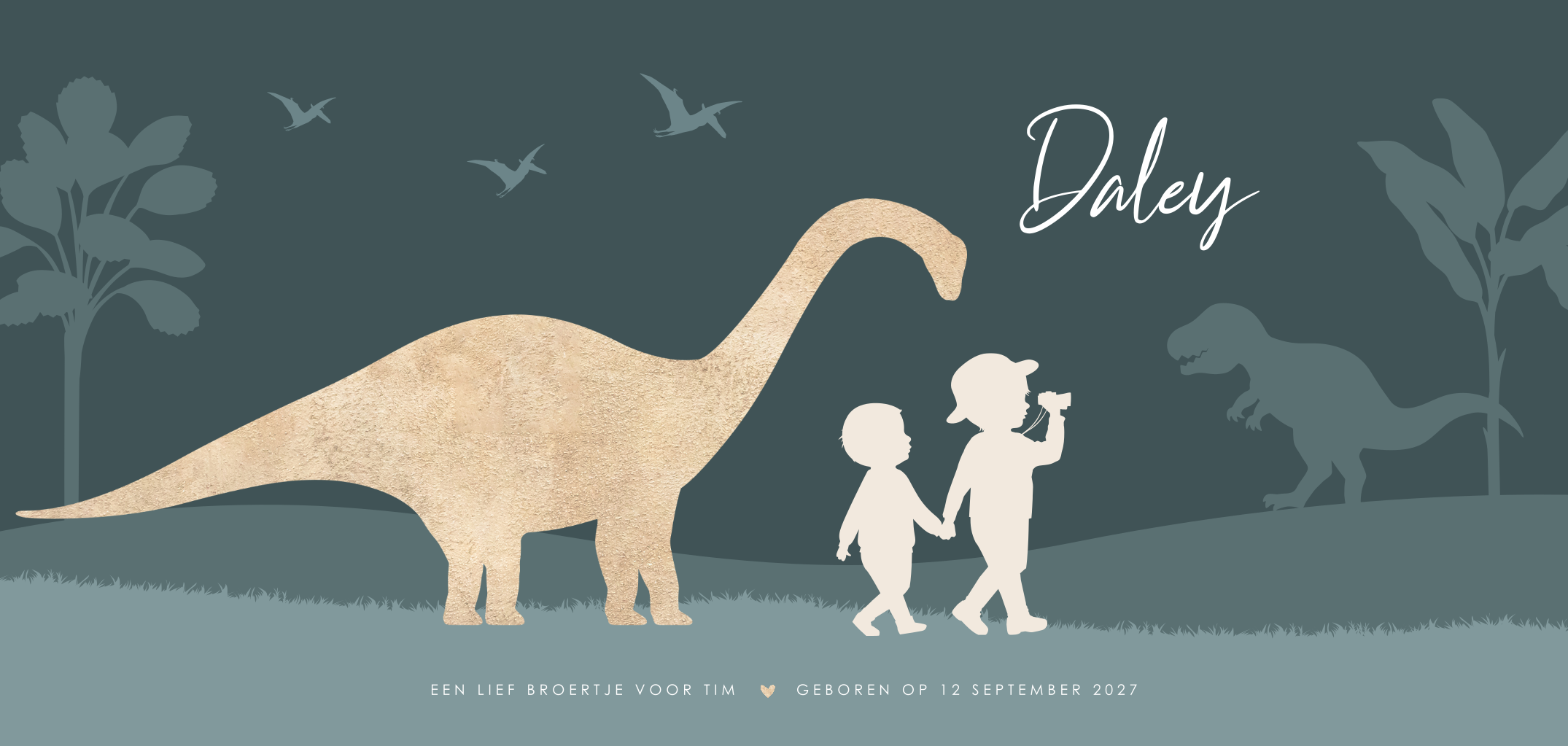Stoer silhouet geboortekaartje voor een tweede kindje, een broertje! Op dit dino jongenskaartje Daley een safari ton sur ton landschap in stoere groene kleuren met twee broertjes hand in hand op avontuur met verrekijker. Op de voor- en achtergrond dino's, een t-rex, langnek en vliegende dinosaurussen in de lucht. Heb je een andere gezinssamenstelling of wil je een ander silhouet gebruiken? Kijk bij onze afbeeldingen voor meer mogelijkheden.