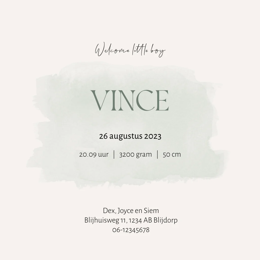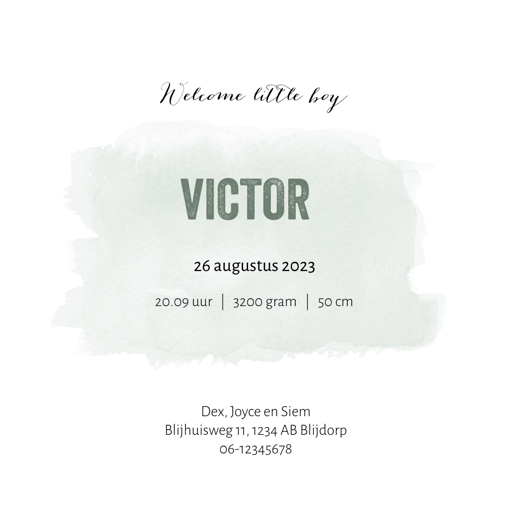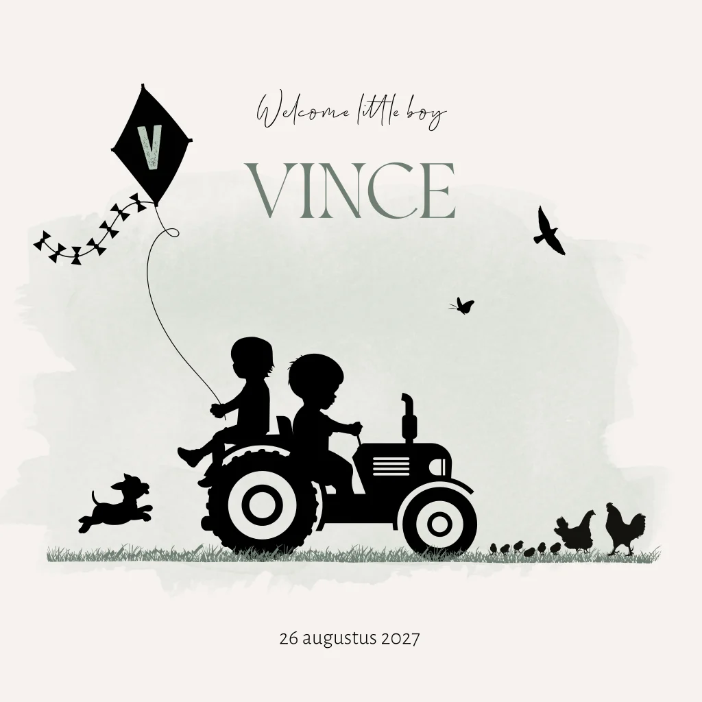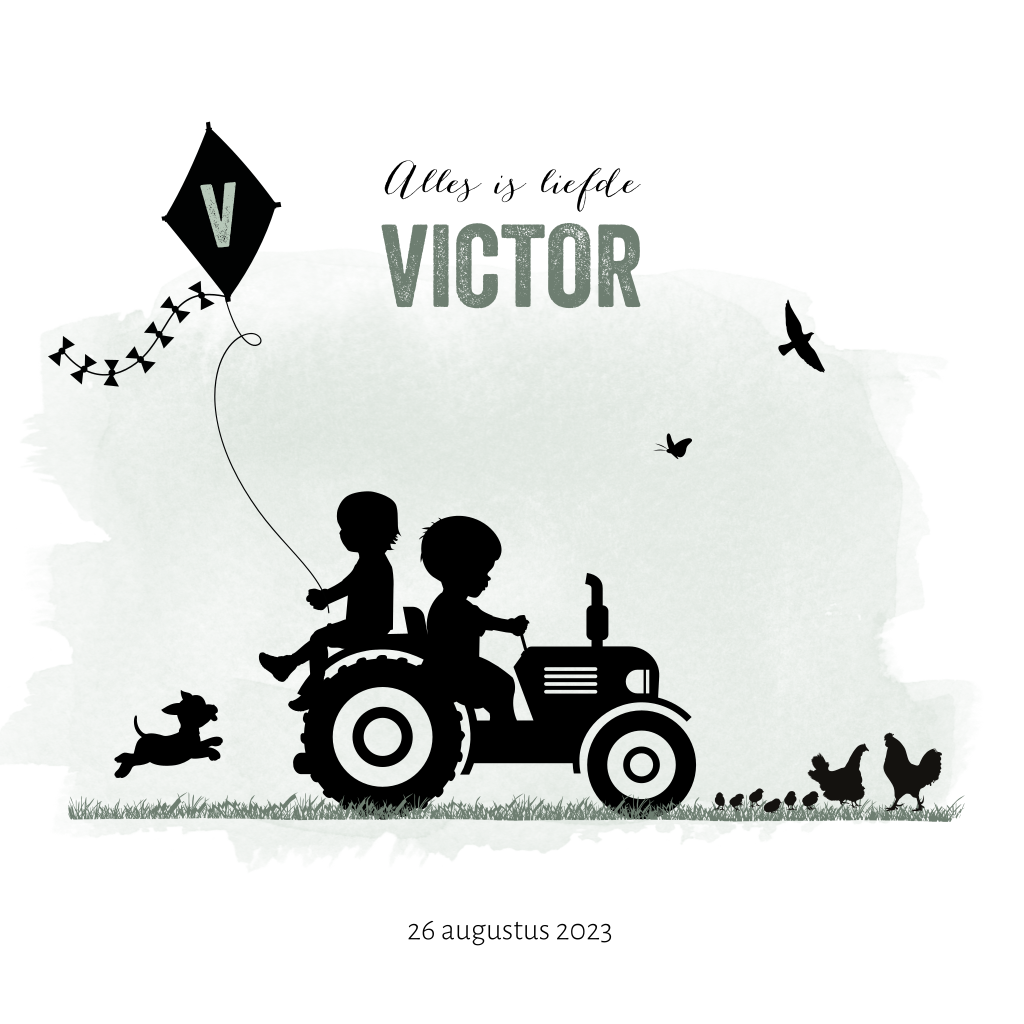 Een hip geboortekaartje voor een broertje. Dit boerderij kaartje Victor bestaat uit 2 jongens op een tractor, met watercolor achtergrond. Het broertje achterop heeft een vlieger in de hand. Het leuke van de vlieger is dat de beginletter van de babynaam hierin gezet kan worden. Verder staan op dit boerderij geboortekaartje kippen, kuikens en een grappig hondje. De groene kleur geeft een stoer tintje aan deze babykaart.