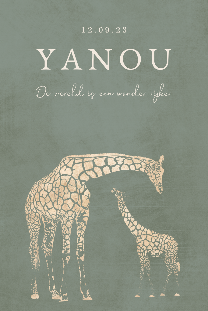 Stoer geboortekaartje voor een jongen met twee giraffes: een grote en een kleine. De ruwe achtergrond in de kleur legergroen maakt dit babykaartje Yanou stoer. Teksten, kleuren, afbeeldingen en lettertypes pas je eenvoudig aan in onze editor. Speciale wensen of hulp nodig? Laat het ons weten!