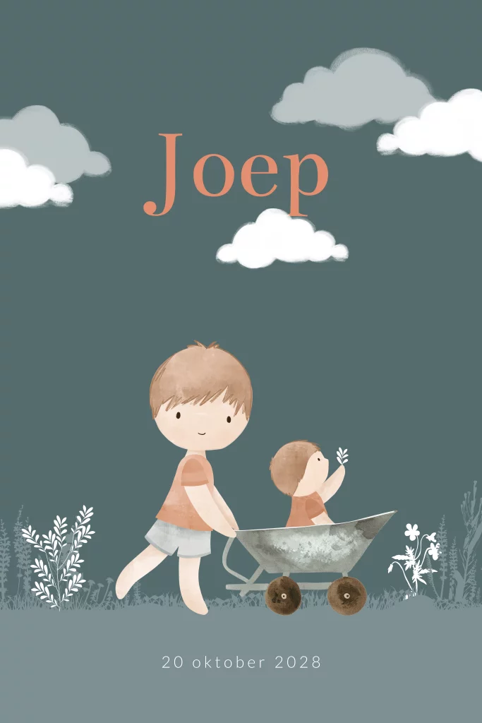 Geboortekaartje voor een jongen met twee broertjes. Je ziet op dit geboortekaartje Joep een grote broer die zijn kleine broertje voortduwt in een kruiwagen. De kaart heeft afgeronde hoeken en de achtergrond heeft een stoere blauwe kleur met wolken. Pas de teksten, lettertypes en kleuren eenvoudig aan in de editor. Hulp nodig bij het ontwerpen? Neem contact met ons op!