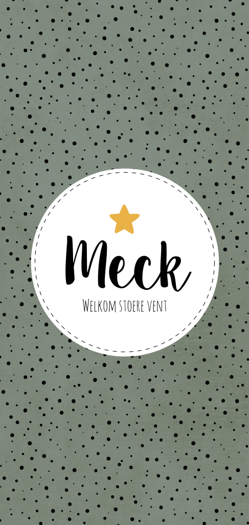 Hip geboortekaartje voor een zoon met op de achtergrond een stippen patroon. De babynaam Meck staat in een cirkel. Op de achterzijde worden de geboortegegevens weergegeven met symbolen. Teksten en kleuren zijn aan te passen in de editor.