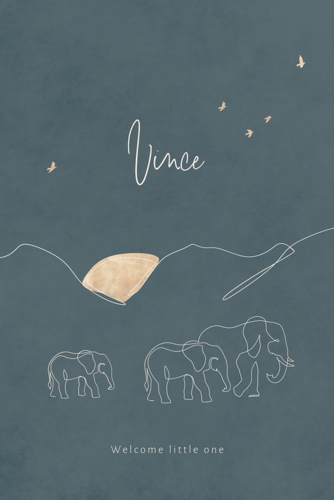 Jongens geboortekaartje met one line illustraties van schattige olifantjes. Dit dieren kaartje Vince heeft een blauwe velvet / velours look achtergrond. De teksten en de lijntekening in het wit komen hierop mooi naar voren. Verder op dit kaartje enkele goudkleurige vogeltjes en een ondergaande zon. Pas dit babykaartje naar je eigen smaak aan in de editor.