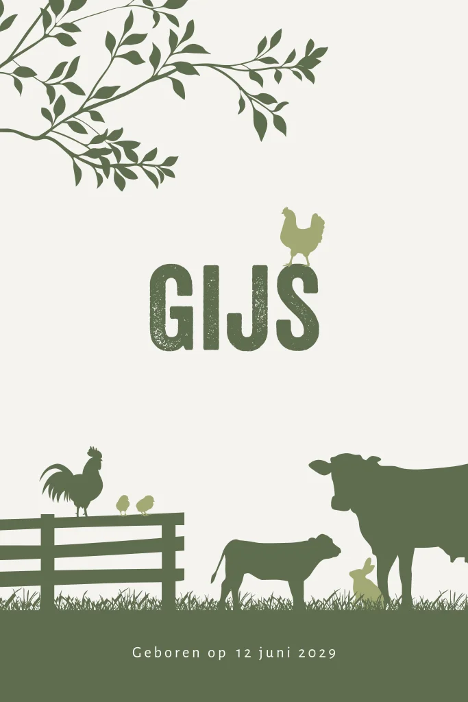 Boerderij geboortekaartje voor een zoon met verschillende boerderij dieren. Op dit jongenskaartje Gijs staat een koe, een kalfje, een haan op een hek, een kip, kuikentjes en een konijntje. Een mooie kleurencombinatie van legergroen met okergeel. Teksten en kleuren zijn aan te passen in de editor. Ook kun je gemakkelijk andere dieren toevoegen om je kaartje helemaal naar wens te maken.