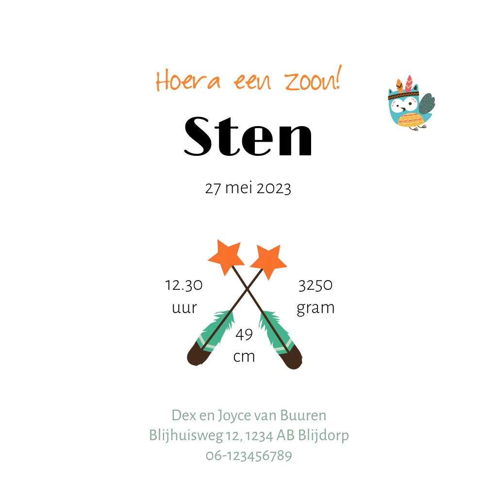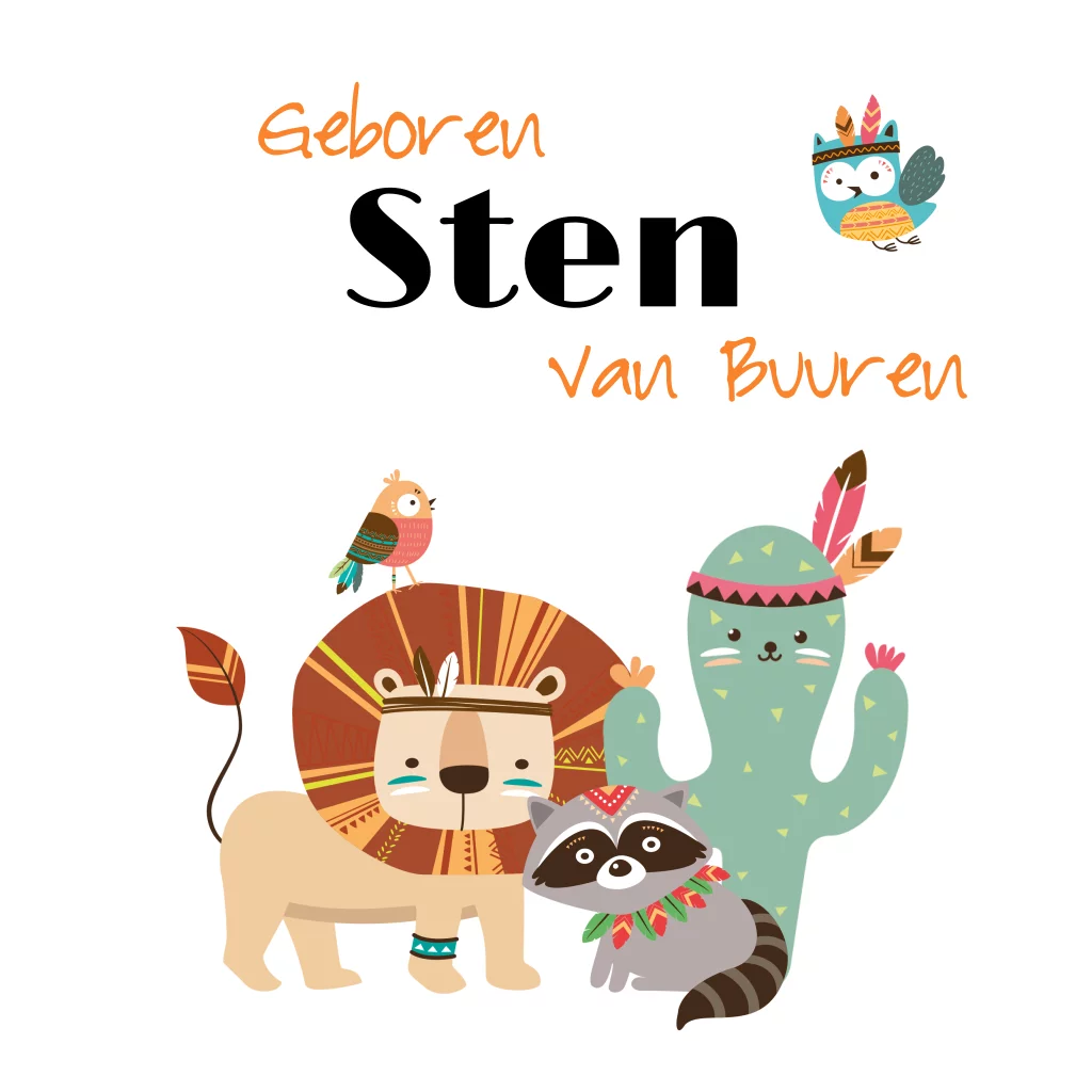 Speels geboortekaartje voor een jongen. Op dit kaartje met de babynaam Sten staan vrolijke illustraties van safari dieren en bos dieren, waaronder een leeuw en uil. Verder is de kaart gedecoreerd met pijlen, een cactus en sterretjes. De kleuren en teksten zijn gemakkelijk aan te passen.