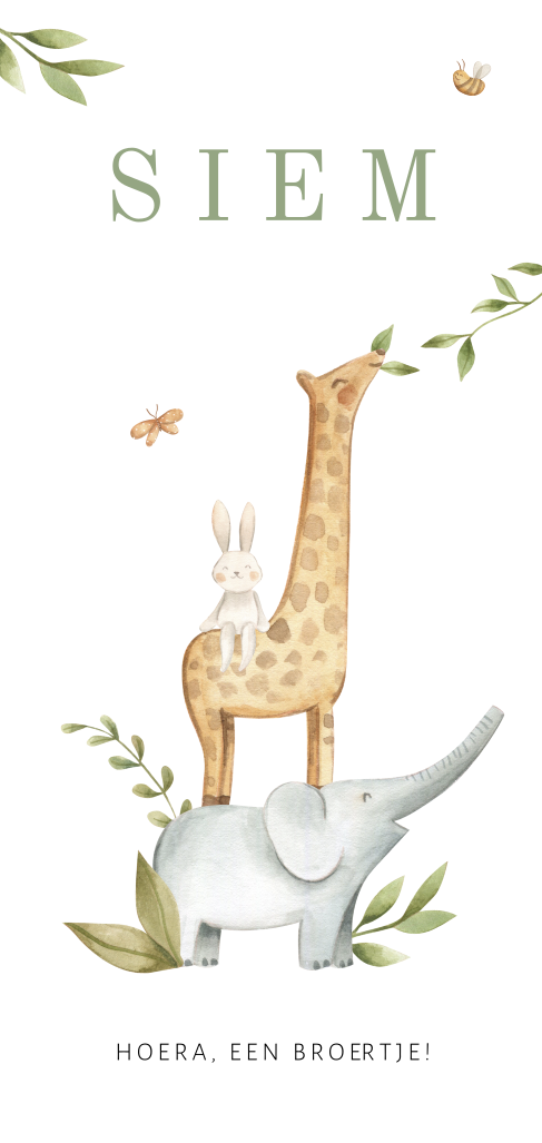 Een lief geboortekaartje voor een jongen. Op dit babykaartje Siem staan drie dieren boven op elkaar, wat een grappig effect geeft. Dit zijn een olifantje, giraffe en een konijntje. Verder op dit kaartje enkele takjes, een vlindertje en een bij. Wil je meer, of andere afbeeldingen toevoegen passend bij dit thema, dan kun je deze afbeeldingen vinden in de editor in het mapje: Thema Lief Aquarel. Ook de teksten en kleuren zijn naar wens aan te passen.