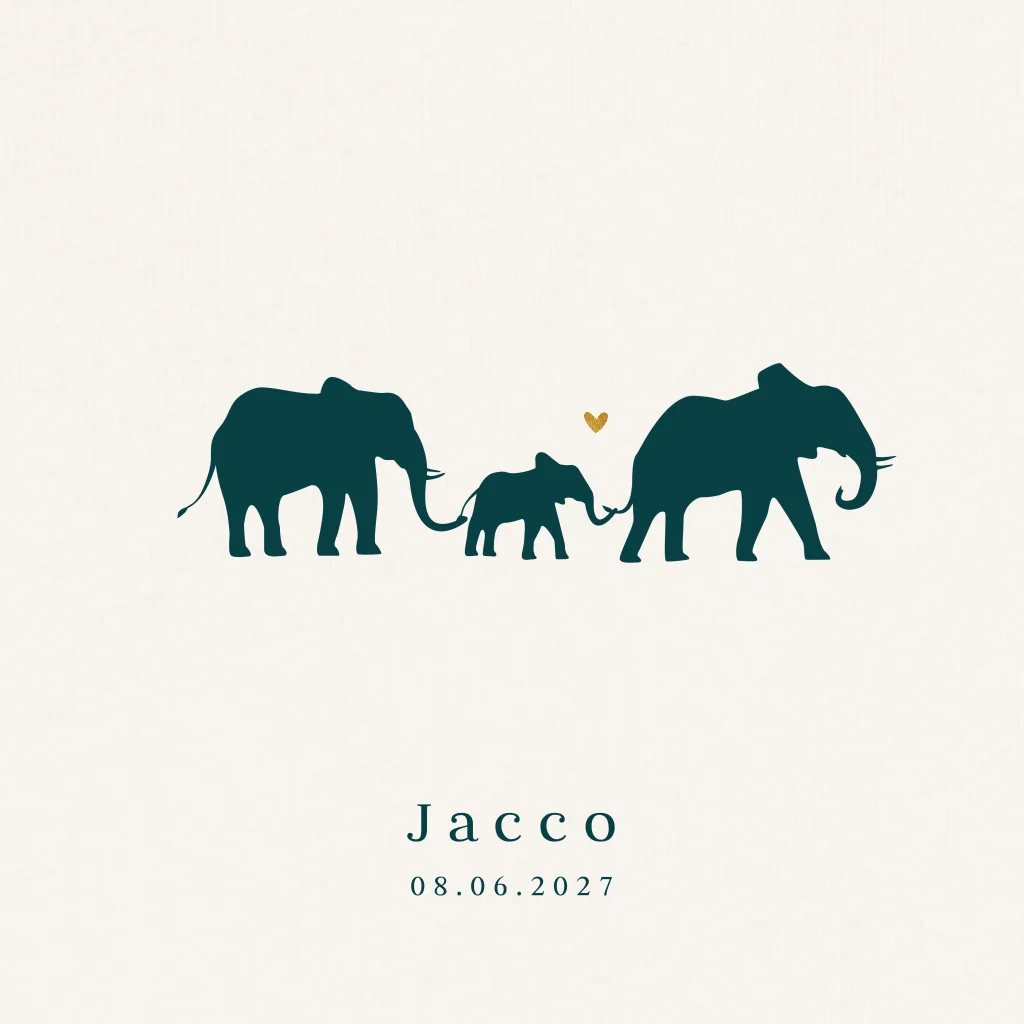 Geboortekaartje voor een jongen met olifantjes gezin bestaande uit drie olifantjes. Op dit kaartje Jacco staan 2 grotere olifanten en een klein baby olifantje. Je kunt dit ook aanpassen naar een andere gezinssamenstelling. De kleine hartjes maken het kaartje compleet.