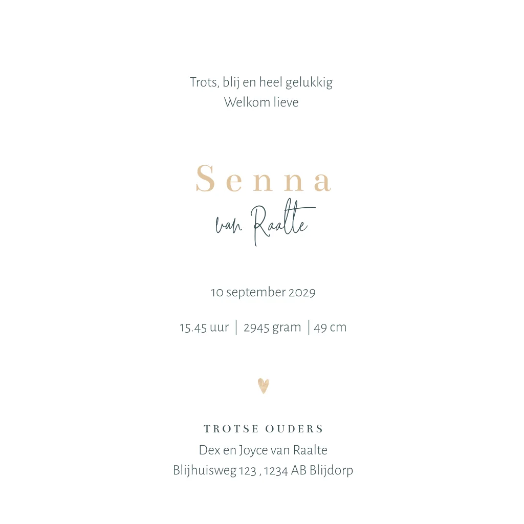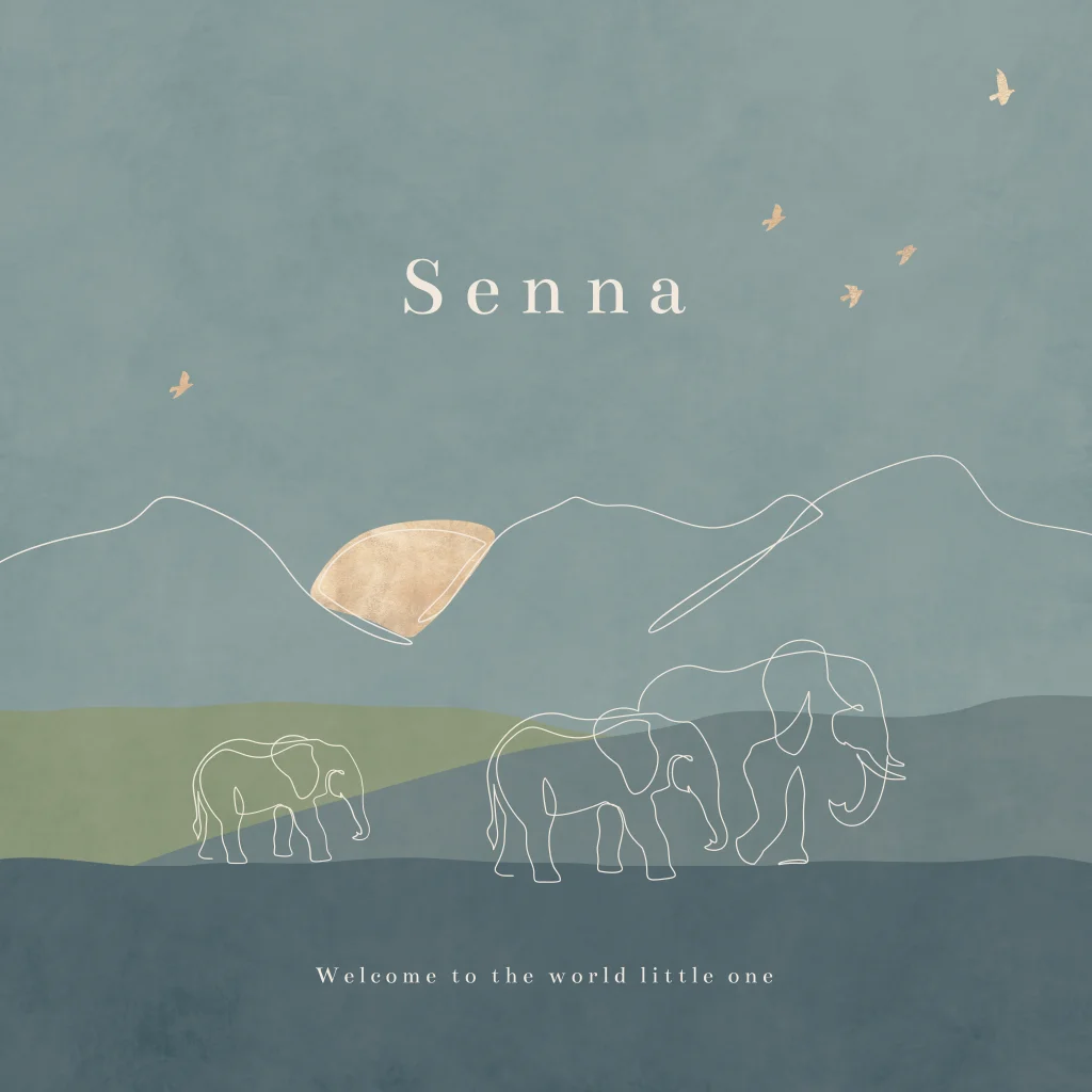 Geboortekaartje voor een zoon met one line illustraties van schattige olifantjes. Dit dieren kaartje Senna heeft een velvet / velours look achtergrond in verschillende blauwe tinten. De teksten en de lijntekening in het wit komen hierop mooi naar voren. Verder op dit kaartje enkele goudkleurige vogeltjes en een ondergaande zon. Pas dit jongenskaartje naar je eigen smaak aan in de editor.