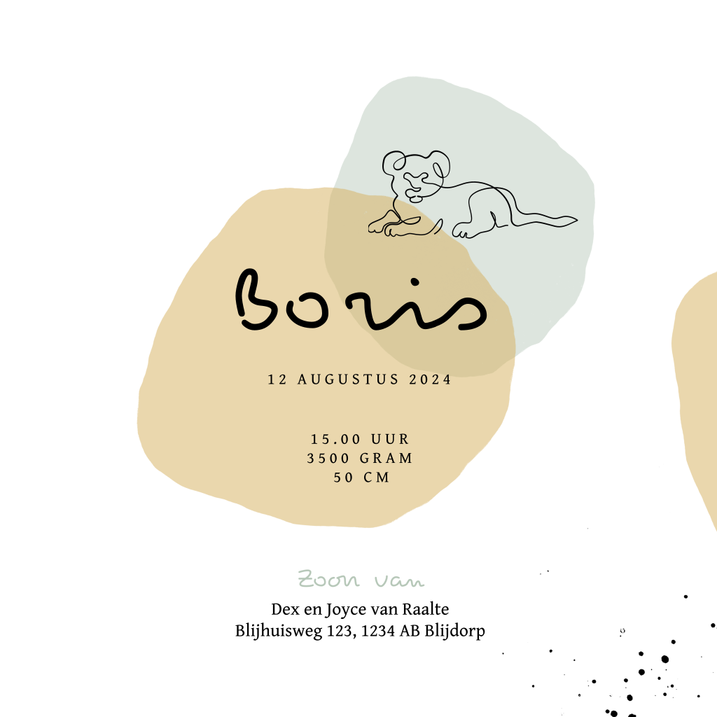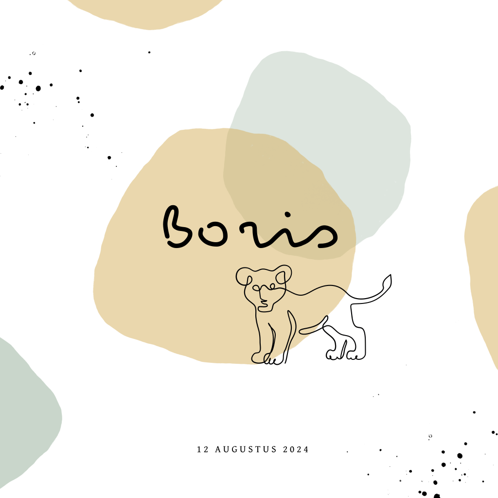 Hip dieren geboortekaartje voor een zoon. Op dit jongenskaartje Boris staat een one line illustratie van een lief klein welpje. Daar omheen enkele abstracte cirkels in zachte grijsblauwe en goudgele tinten. Pas dit kaartje naar je eigen smaak aan in onze editor.