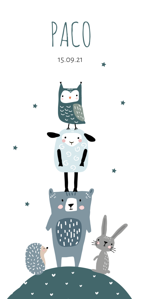 De dieren op dit babykaartje zijn: een egeltje, een konijn, een beer, een schaapje en een uiltje. Rondom staan kleine sterretjes. Dit hippe kaartje met dieren is gemakkelijk aan te passen.