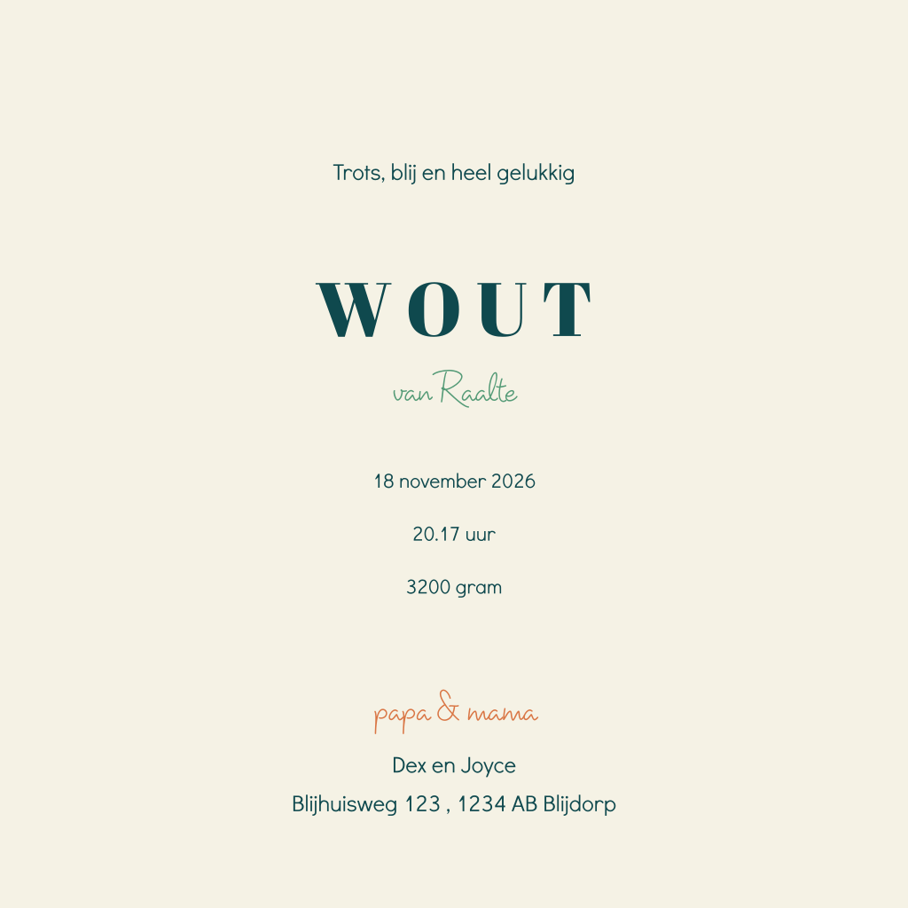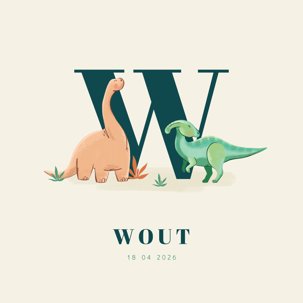 Stoer geboortekaartje Wout met de voorletter W van je kindje. Voor de letter staan 2 handgetekende dino's. Kleuren, teksten en afbeeldingen pas je eenvoudig aan in onze ontwerpmodule. Hulp nodig? Bel, chat of mail gerust!