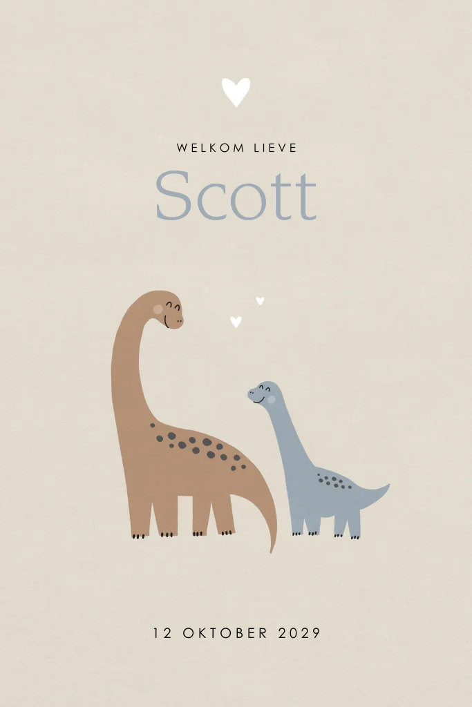 Lief dino geboortekaartje voor een jongen. Dit kaartje Scott heeft een linnenlook achtergrond met daarop een illustratie van twee dinosaurussen, een moeder of vader met zoon. De dino's maken dit babykaartje helemaal af. Dit babykaartje is ook zeker geschikt voor een tweede kindje. Hulp nodig bij het aanpassen van dit jongenskaartje? We helpen graag!