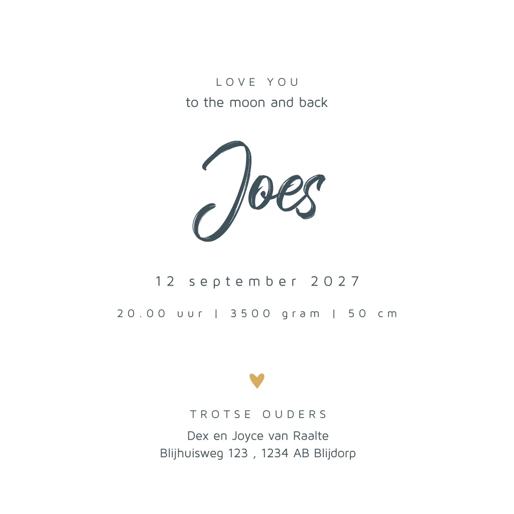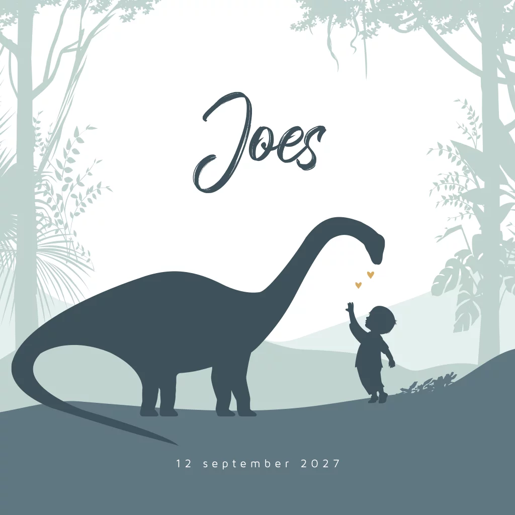 Ton sur ton silhouet geboortekaartje voor een eerste kindje, jullie zoon! Op dit prachtige blauwe jongenskaartje een silhouet van een dinosaurus met een jongetje. De hartjes maken dit plaatje compleet. Teksten, kleuren en de silhouetten kun je aanpassen in de editor. Vragen of wensen? Laat het gerust weten, wij helpen je graag.