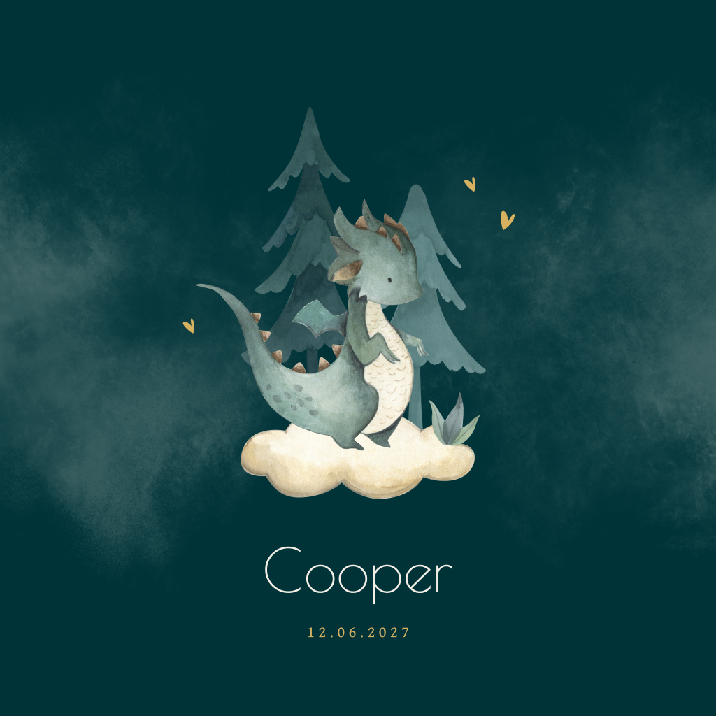 Magisch jongens geboortekaartje volgens de nieuwste trend Dreamland. Dit kaartje Cooper is stoer en lief tegelijk door de donkerblauwe kleuren in combinatie met een illustratie van een lief draakje. Pas dit geboortekaartje naar je eigen smaak aan in de editor. Hulp nodig? Wij helpen je graag!