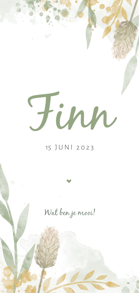 Lief en rustig geboortekaartje voor een zoon met aquarel en droogbloemen. Op dit babykaartje Finn zijn mooie zachte kleuren gebruikt. Teksten en kleuren zijn aan te passen in de editor.