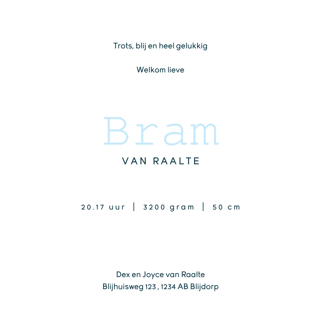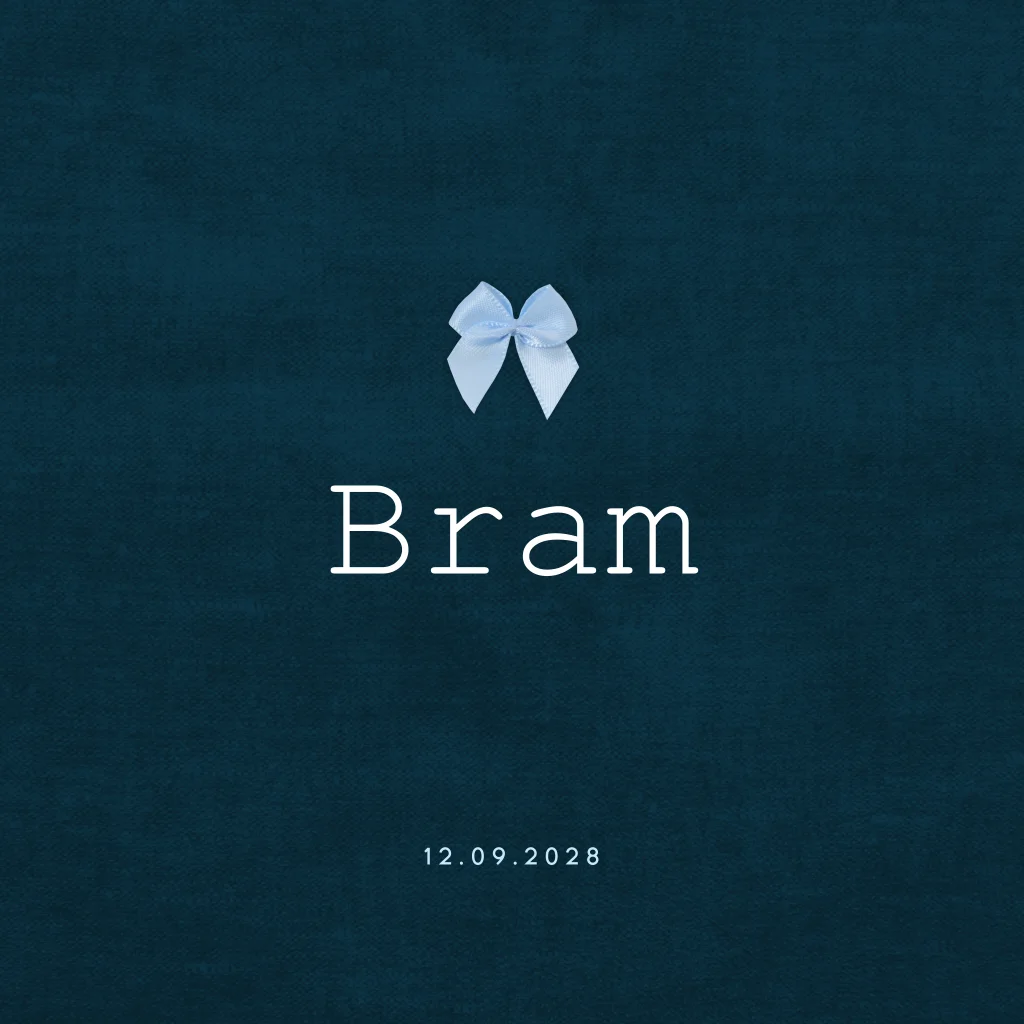 Op zoek naar een stoer maar ook lief geboortekaartje voor jullie kleine jongen? Bekijk dan eens dit geboortekaartje Bram met een stoere donkerblauwe jeanslook achtergrond en echt strikje. Pas de kleuren, teksten en kleur van de folie gemakkelijk aan in de editor. Hulp nodig? Wij helpen je graag.