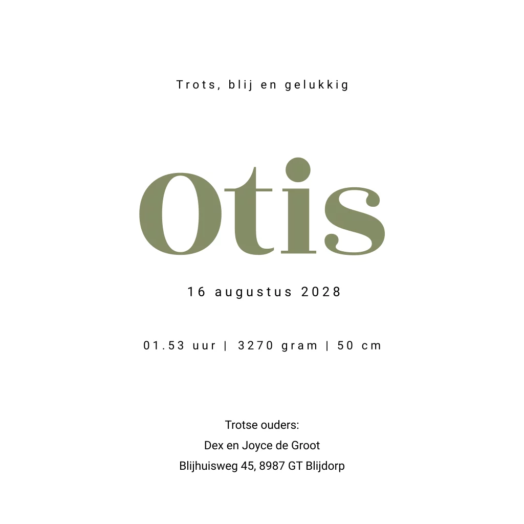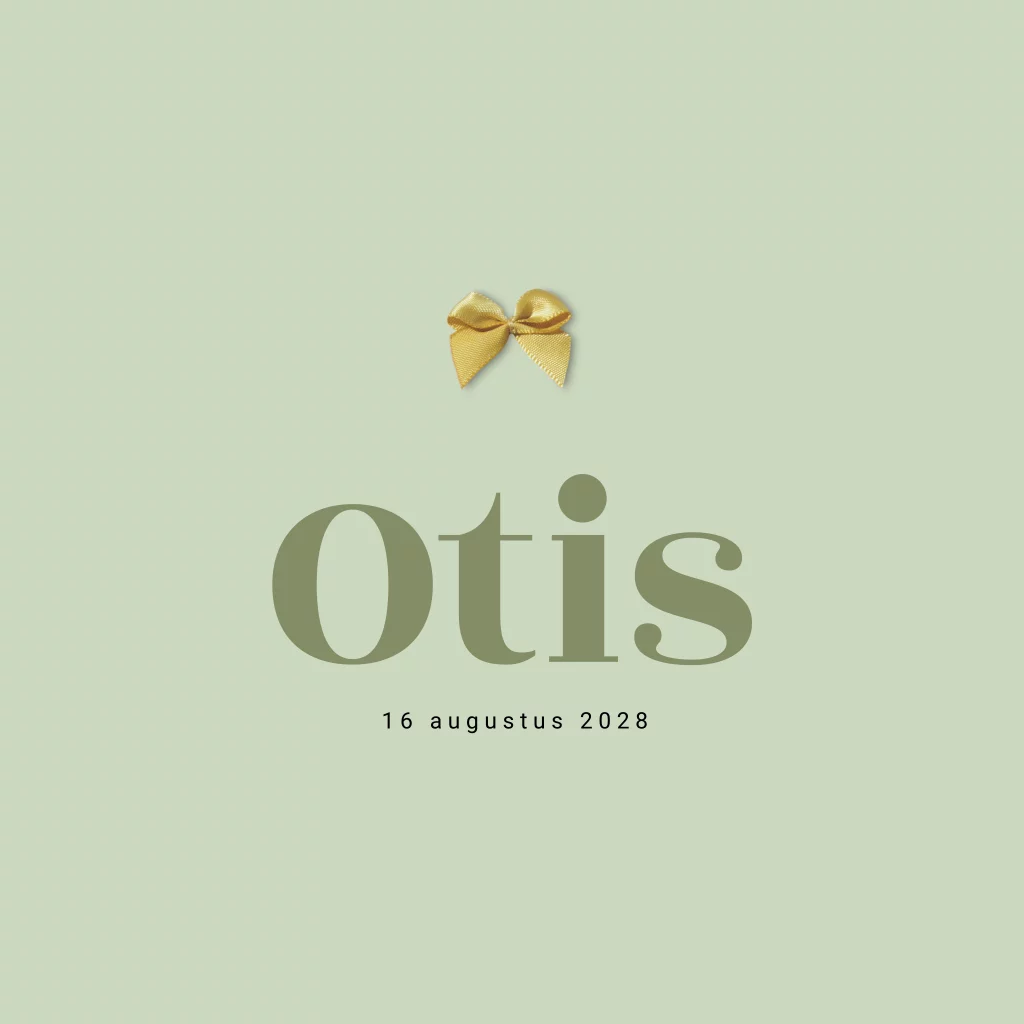 Klassiek geboortekaartje voor een zoon. Op dit geboortekaartje voor een jongen een mooie groene achtergrond met een echt strikje. Het strikje op dit kaartje Otis dient als voorbeeld en wordt niet gedrukt! Op die plek kun je straks zelf het échte strikje plakken. Ga direct naar: