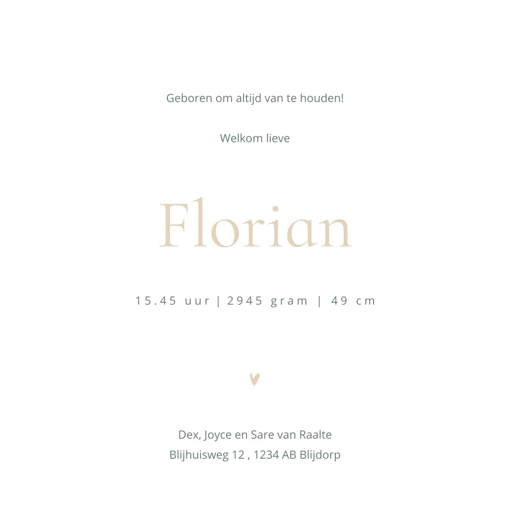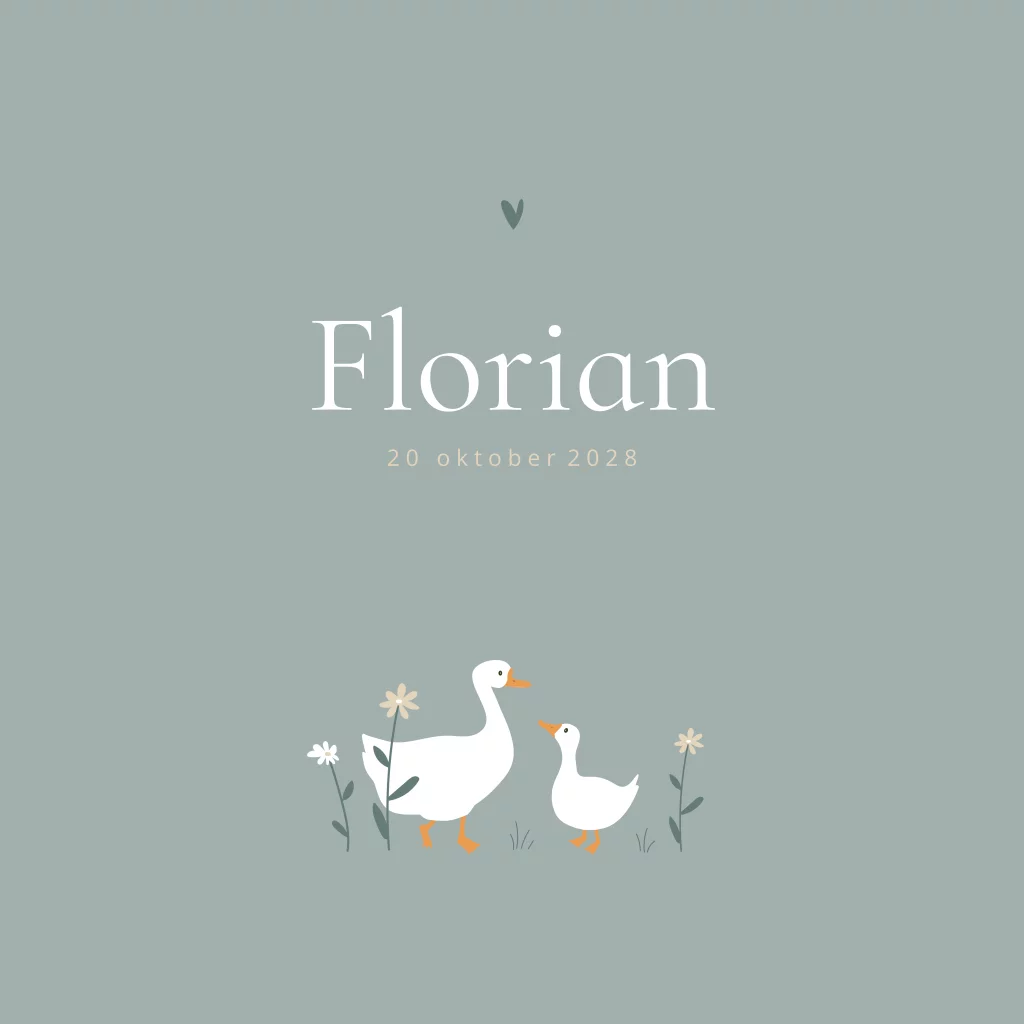 Dieren geboortekaartje voor een jongen met een lieve illustratie van eenden. Dit geboortekaartje is ook ideaal voor gezinnen met zowel een broer als een zus die de komst van hun nieuwe baby broertje willen vieren. Een eend of gans op je uitgekozen geboortekaartje is helemaal leuk! Pas dit geboortekaartje Florian eenvoudig aan in de editor.