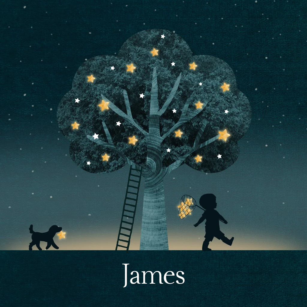 Magisch en stoer geboortekaartje met foliedruk voor een jongen. Op dit geboortekaartje James zie je een jongetje met zijn hondje in de nacht op pad. Het jongetje heeft een netje met sterren bij zich. in de boom vonkelen ook verschillende sterren in luxe goudfolie. Een bijzonder en uniek geboortekaartje met luxe folie en silhouetten. Foliedruk geboortekaartjes zijn een echte eyecatcher en staan garant voor een unieke uitstraling.