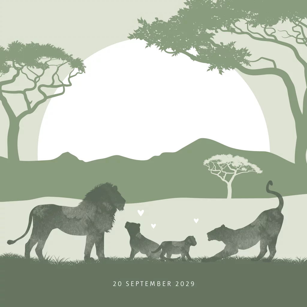 Stoer jungle geboortekaartje voor een jongen met een leeuw en welpjes. De naam Jason wordt in goudfolie gedrukt. Op de achtegrond zie je een ondergaande zon en bomen in mooie groentinten.