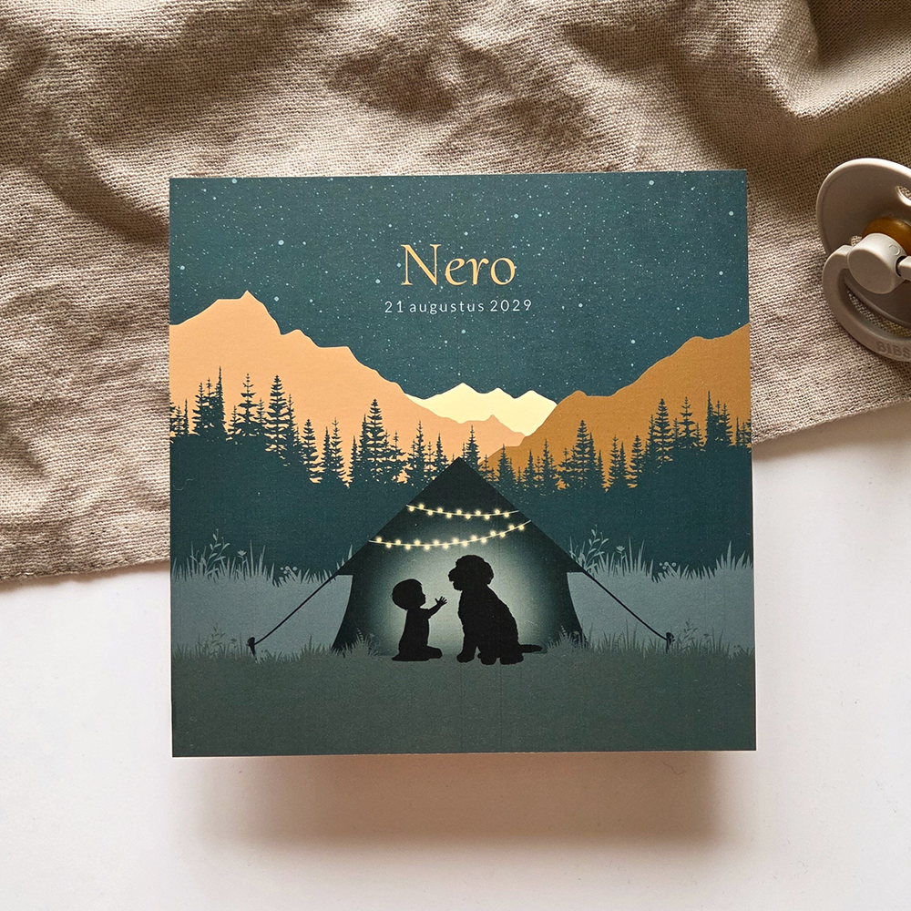 Op zoek naar een avontuurlijk geboortekaartje voor een jongen? Kies dan voor dit prachtige geboortekaartje. Op dit kaartje Nero zie je een silhouet van een tent waar een jongetje en hondje samen in zitten. Verder zie je een dromerig berglandschap met een sterrenhemel. Het goudfolie zorgt voor een luxe touch. Alles is geheel naar eigen wens aan te passen voor het geboortekaartje van jullie zoon. Vragen? Ons team staat voor je klaar.