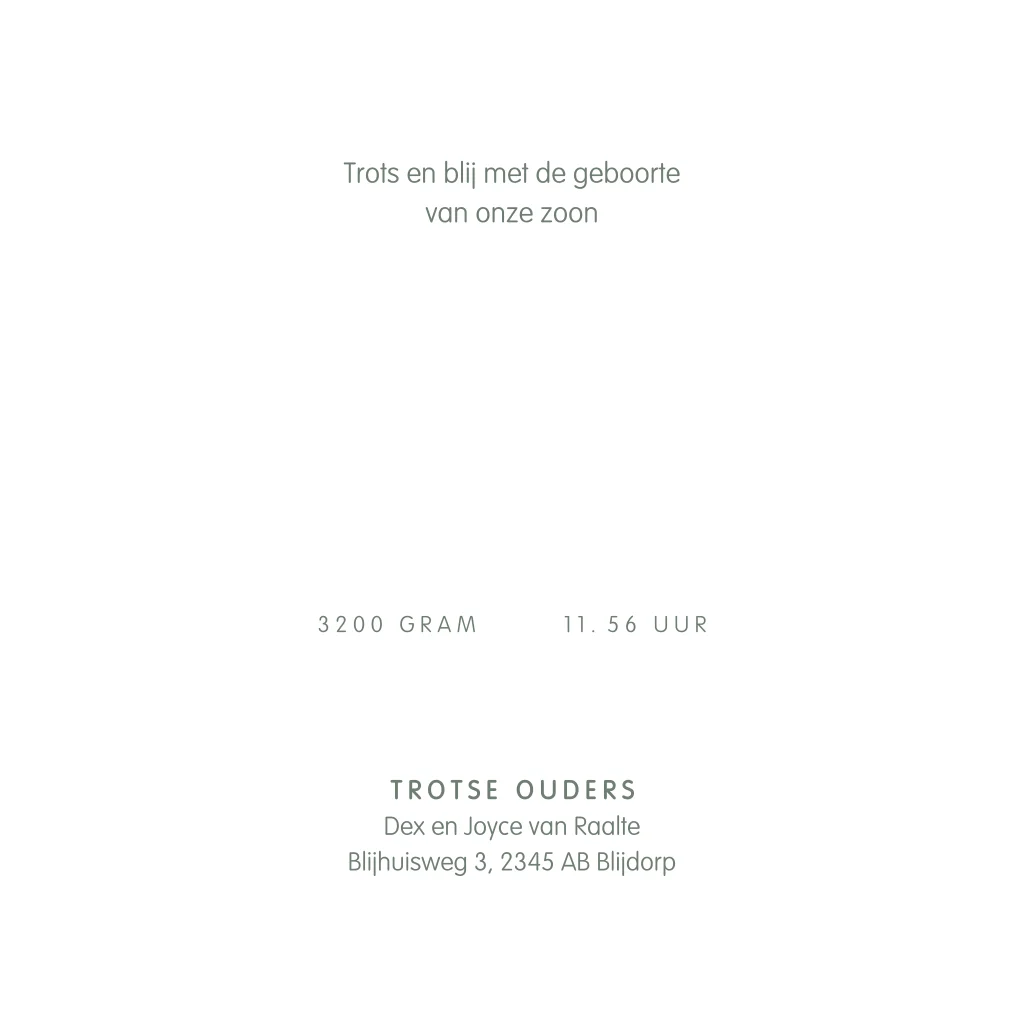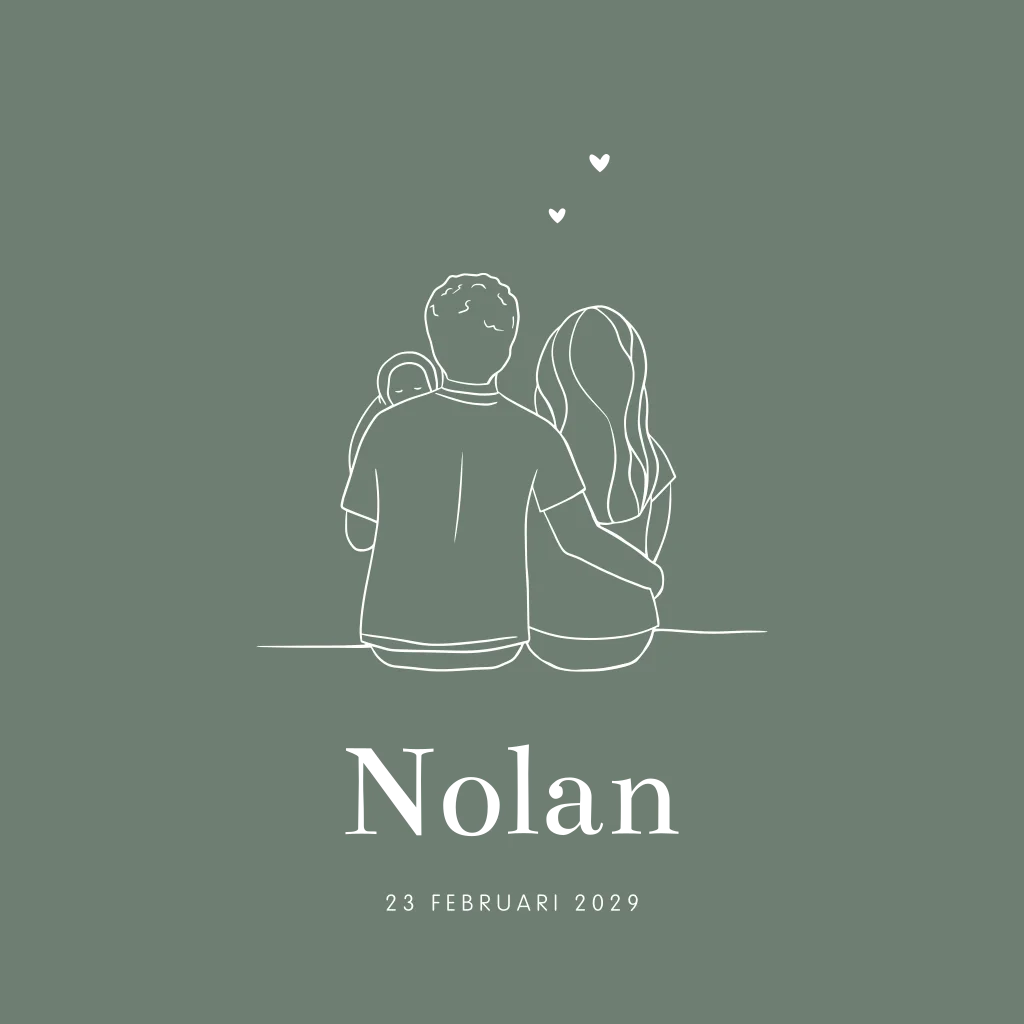 Dit geboortekaartje Nolan is een prachtig ontworpen kaartje dat perfect is voor de aankondiging van de geboorte van jullie zoon. Dit geboortekaartje is voorzien van een mooie lijntekening van een papa, mama en baby'tje. Het rustige ontwerp is voorzien van goudfolie aan beide zijdes van het kaartje. Folie geeft dit geboortekaartje een extra luxe uitstraling. Pas in onze online editor dit geboortekaartje voor een jongen naar eigen wens aan.