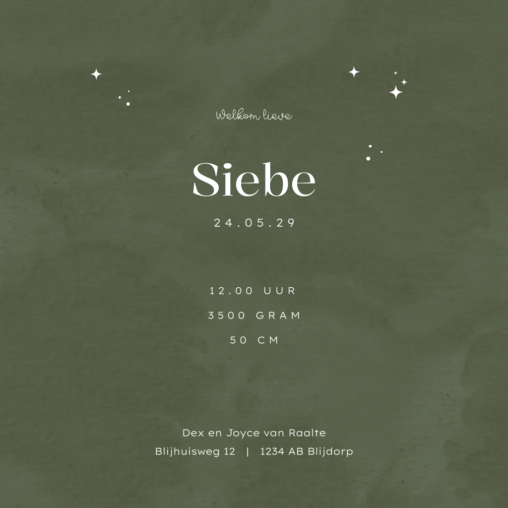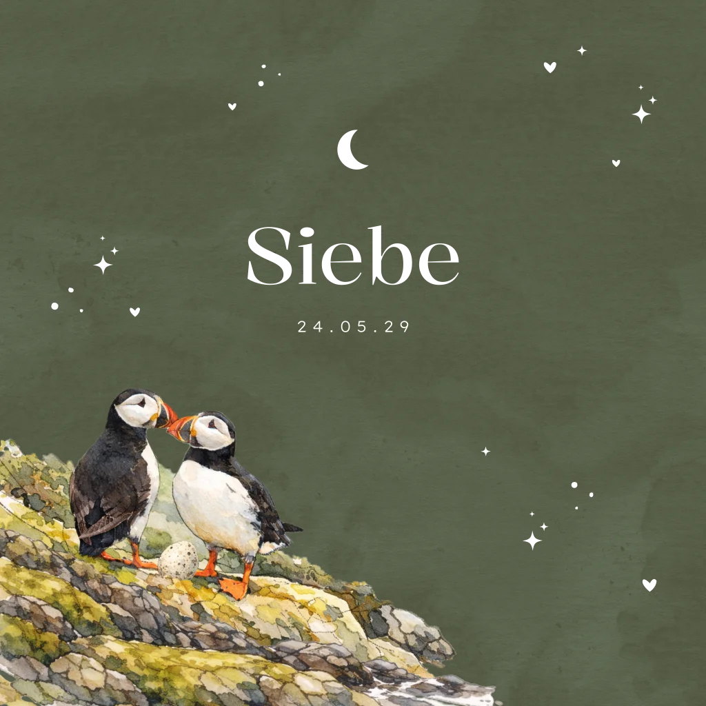 Uniek en luxe geboortekaartje voor een jongen. Op dit geboortekaartje Siebe zie je twee papegaaiduikers met een ei waar de baby vogel in zit. In luxe goudfolie zie je de maan, sterren en romantische hartjes. De foliedruk heeft een mooie glans en geeft het geboortekaartje een luxe uitstraling. Je kunt dit geboortekaartje zelf gemakkelijk bewerken, opslaan en bestellen. Vragen of wensen? Laat het gerust weten, wij helpen je graag.