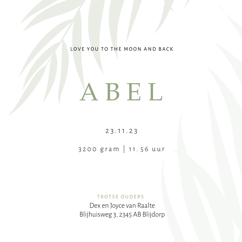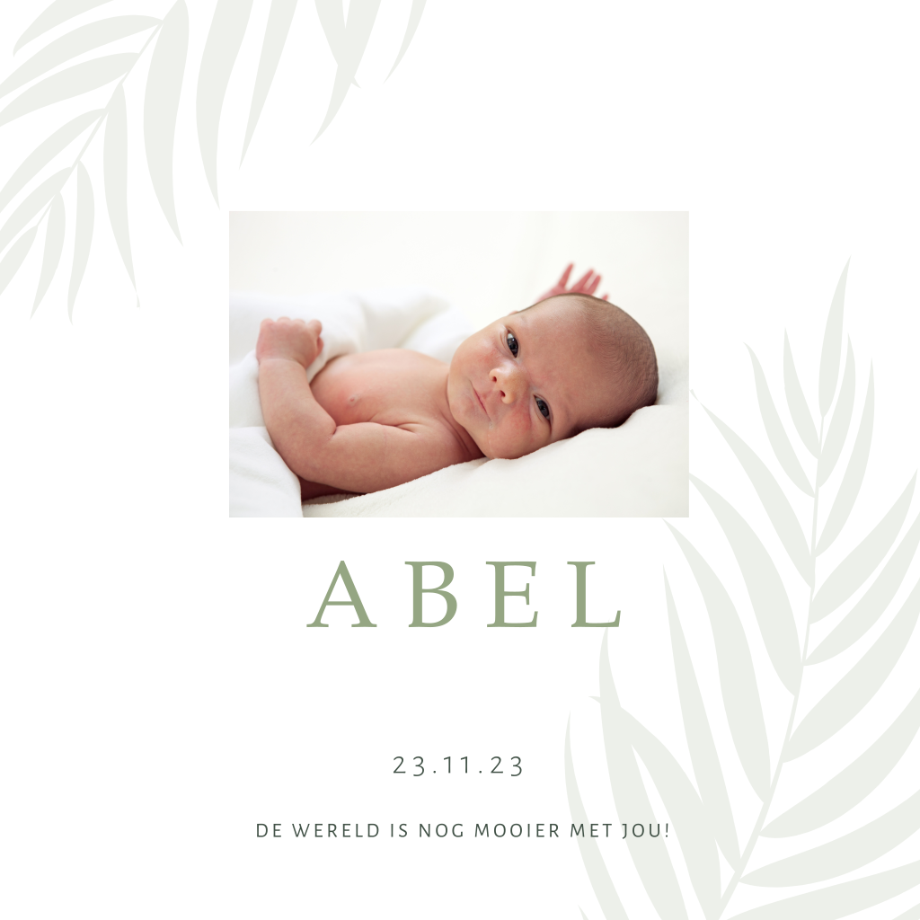 Geboortekaartje voor een jongen. Op dit kaartje Abel voeg je een eigen persoonlijke foto toe. Op de achtergrond staan mooie botanische takken. Verder is de kaart rustig en clean. Kleuren en lettertypes zijn aan te passen in de editor.