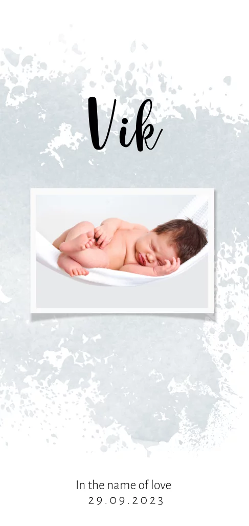Hip geboortekaartje voor een zoon met een foto. Op de achtergrond van dit kaartje Vik staat een aquarel in de kleur grijs blauw. Verder heeft de kaart een rustige uitstraling. Teksten en kleuren zijn aan te passen in de editor.