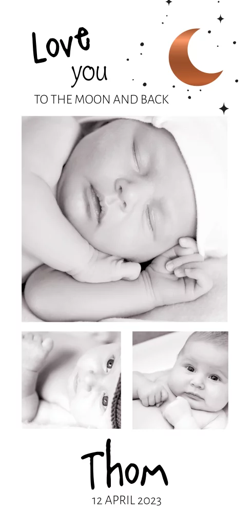 Mooi en uniek geboortekaartje voor een jongen. Op dit kaartje Thom kun je 3 mooie foto's toevoegen van jullie kindje. Het kaartje is overwegend wit met zwarte tekst en een maan in koperkleur. Teksten en kleuren zijn aan te passen in de editor.