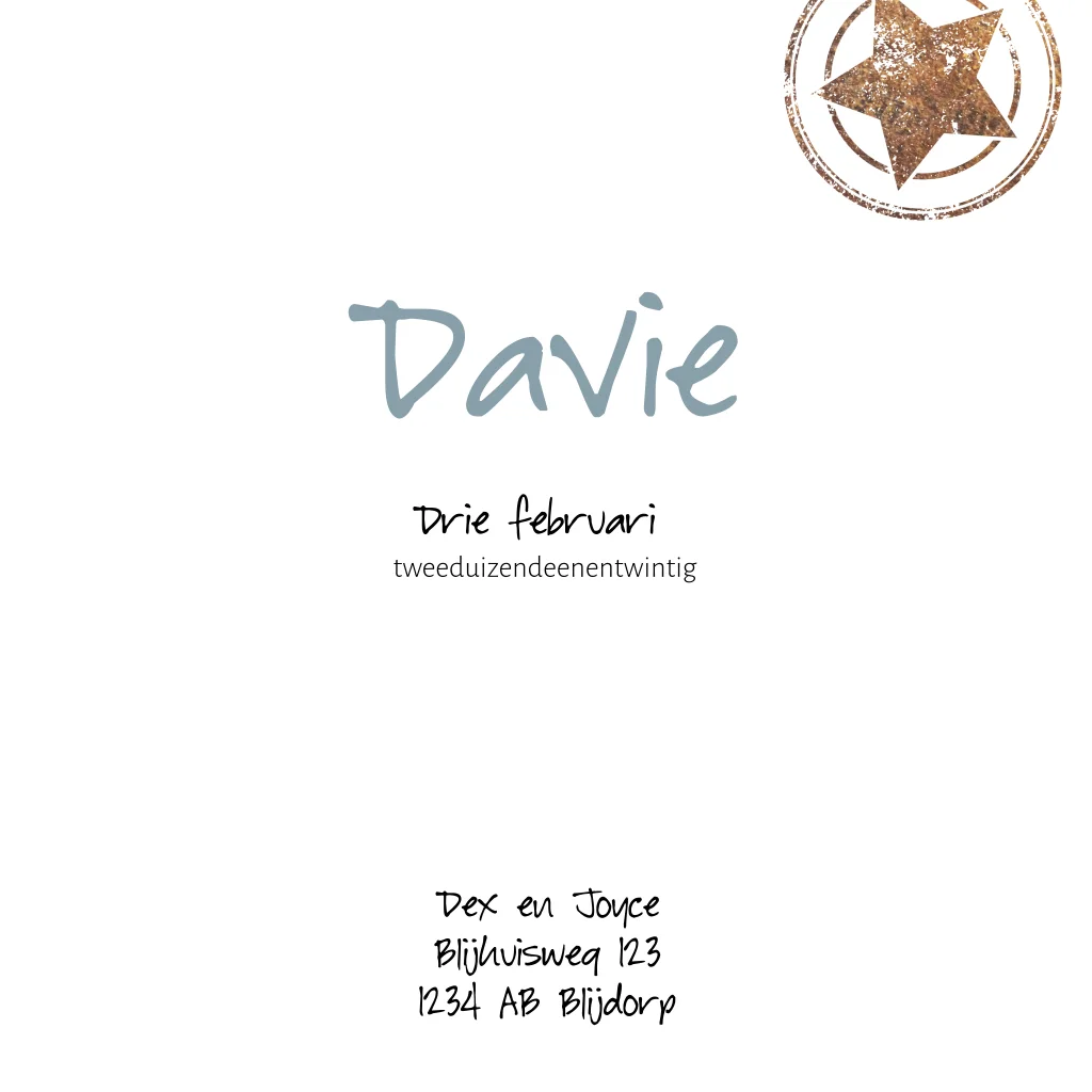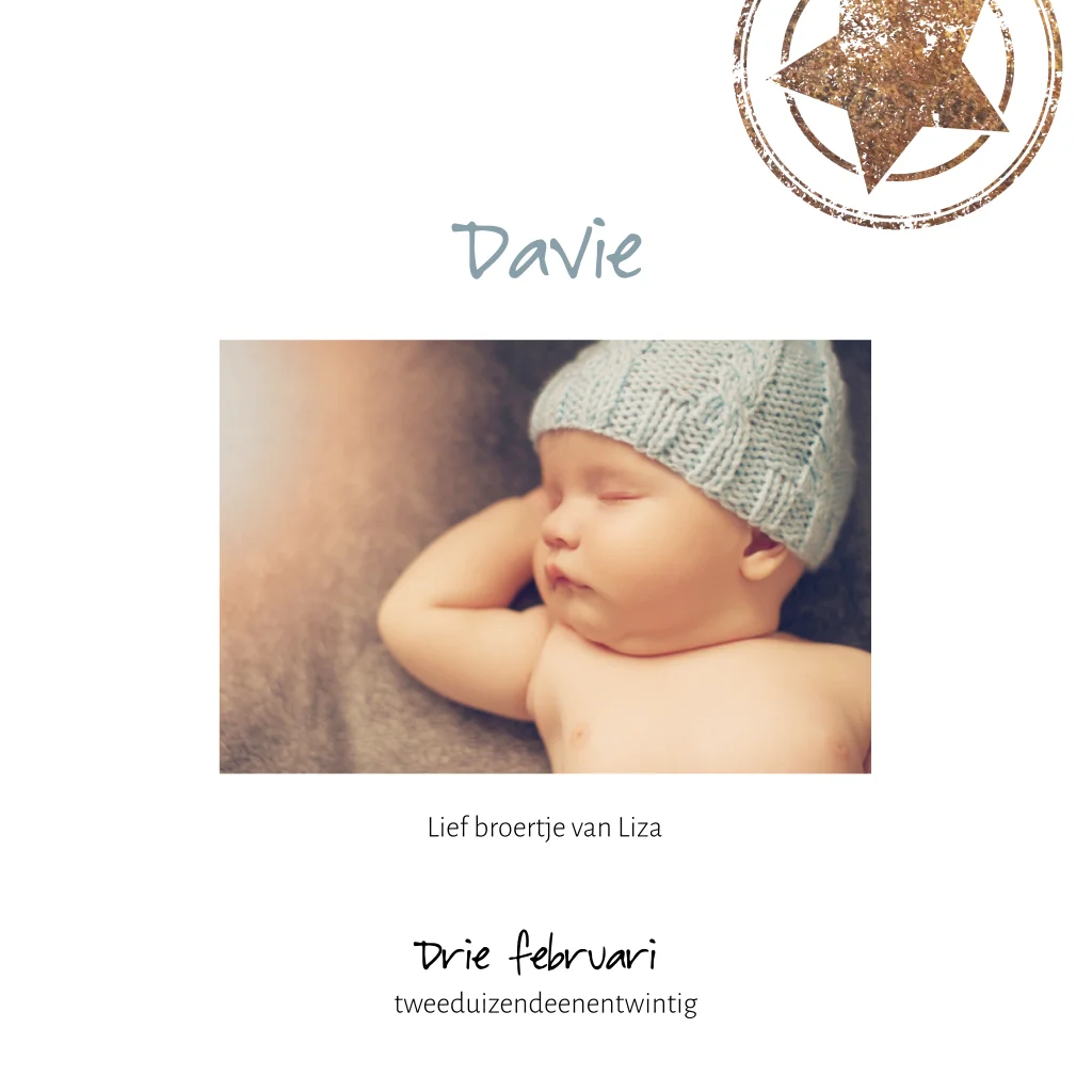 Dit lieve foto geboortekaartje is voor een jongen. Door de foto op de voorkant wordt de kaart echt persoonlijk. De stempel met ster geeft de kaart een stoer tintje.