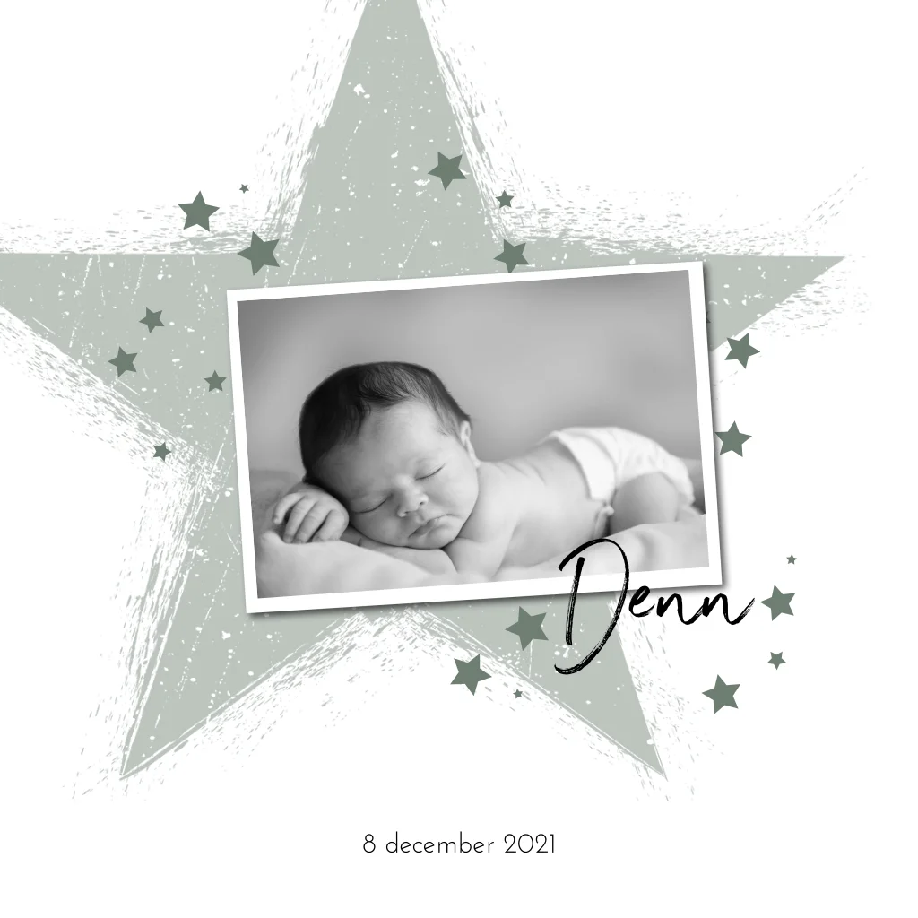 Foto geboortekaartje voor een jongen met een grote aquarel ster. De kleine sterren en geven de kaart een speelse look en door de babyfoto wordt de kaart extra persoonlijk. Deze kaart is gemakkelijk aan te passen.