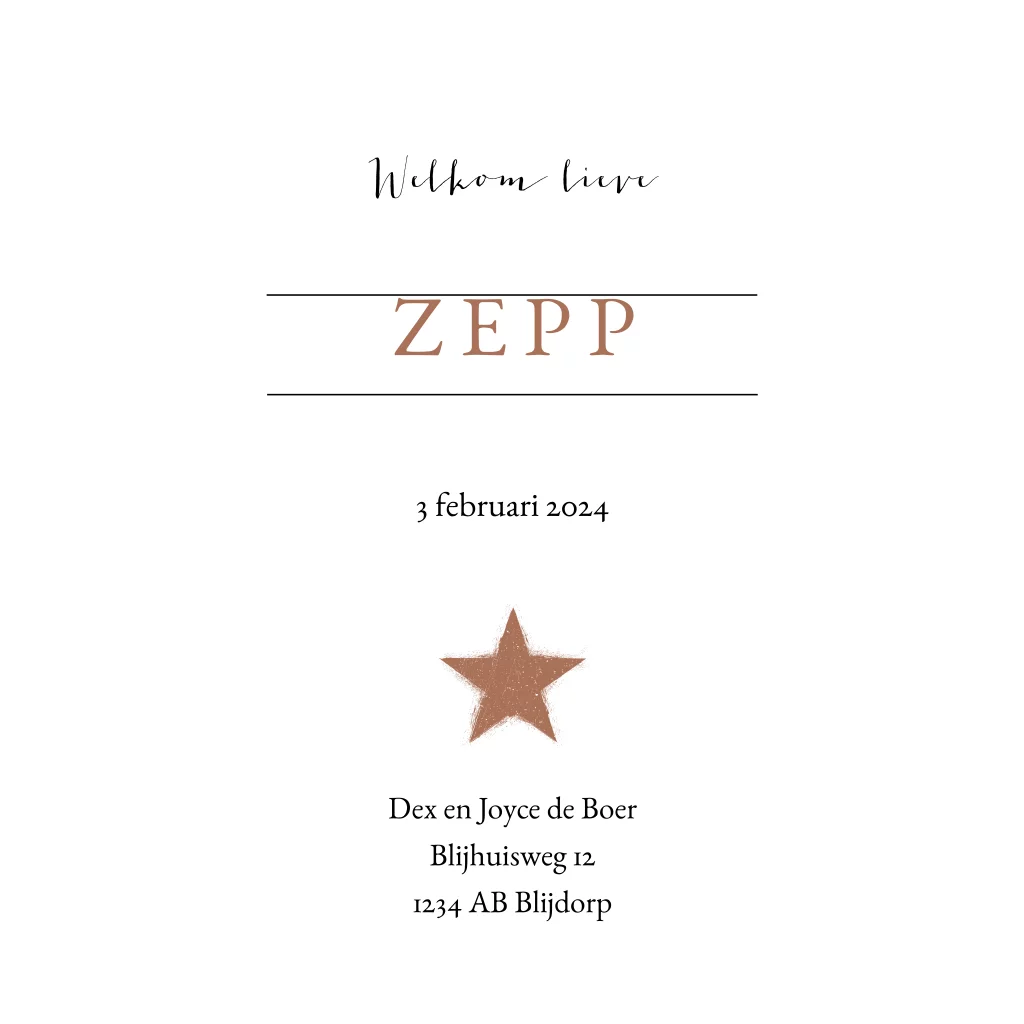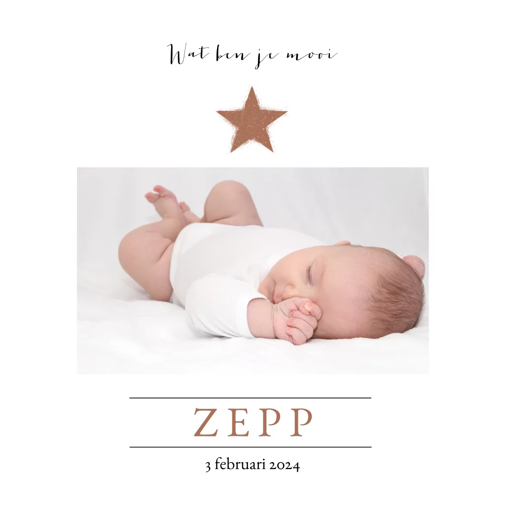 Basic geboortekaartje met eigen foto en koperkleurige ster