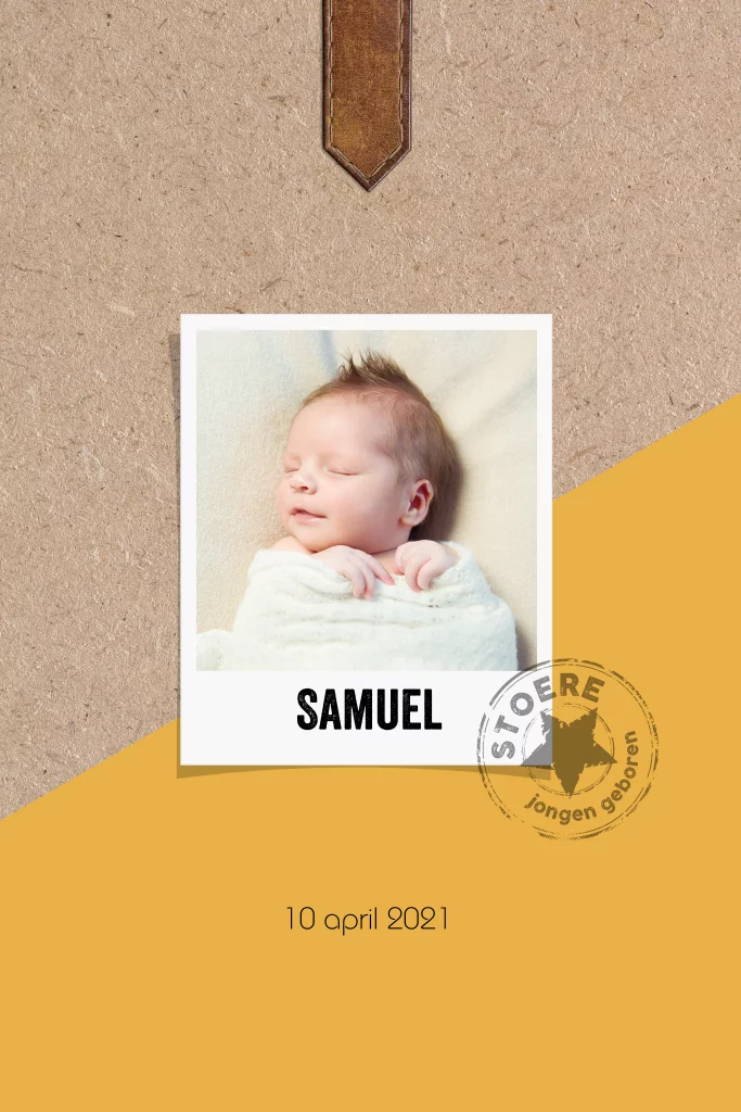 Dit stoere geboortekaartje is voor een jongen. De karton achtergrond met de kleur okergeel, de stempel en het leren label geeft de kaart een stoere look. Door de foto op de voorkant, krijgt de kaart en persoonlijk tintje.