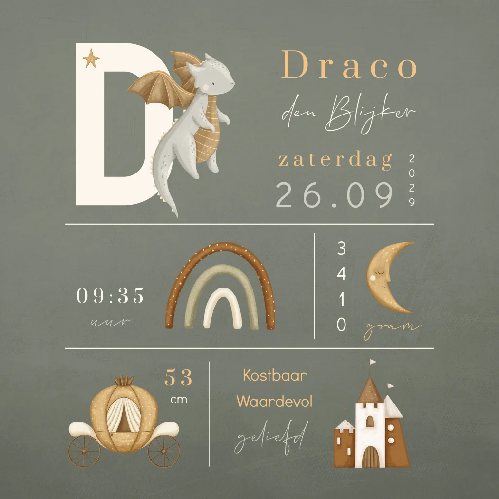 Typografisch geboortekaartje voor een jongen. Op dit babykaartje Draco staat de eerste letter van de babynaam samen met verschillende illustraties van onder andere een lief draakje, kasteel, koets, maan en regenboog.