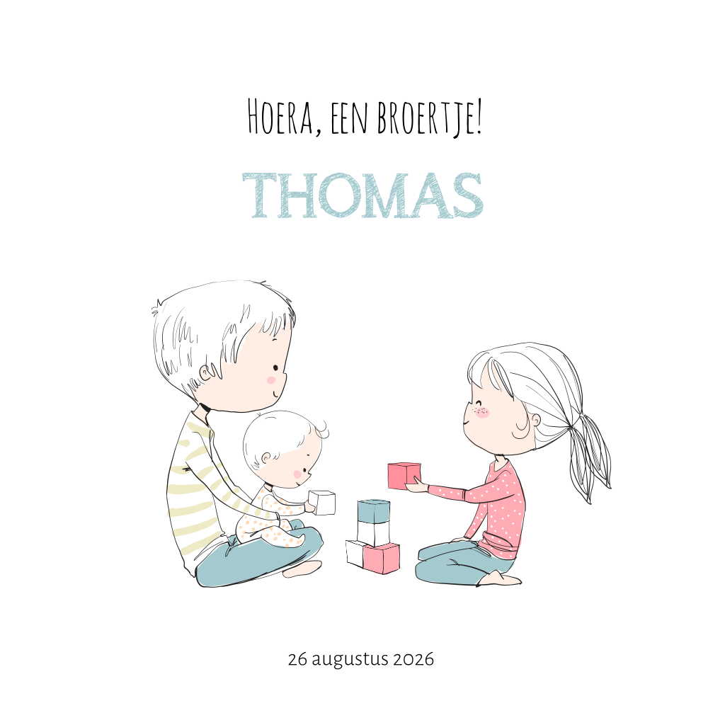 Een getekend geboortekaartje met een illustratie voor een derde kindje. Dit geboortekaartje Thomas is super schattig omdat de drie kindjes met elkaar spelen. Dit babykaartje is eenvoudig zelf aan te passen.