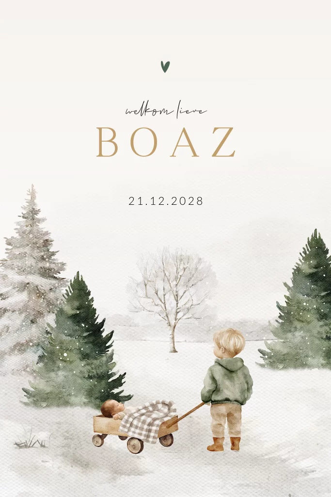 Dit geboortekaartje Boaz laat een lief winters tafereel zien. Je ziet een grote broer samen met een kar staan waar zijn baby broertje in ligt. Je ziet sneeuw, dennenbomen en winterse bomen. Het baby broertje ligt warm onder een dekentje in de kar. Dit geboortekaartje heeft een rustige winterse uitstraling en ronde hoeken.