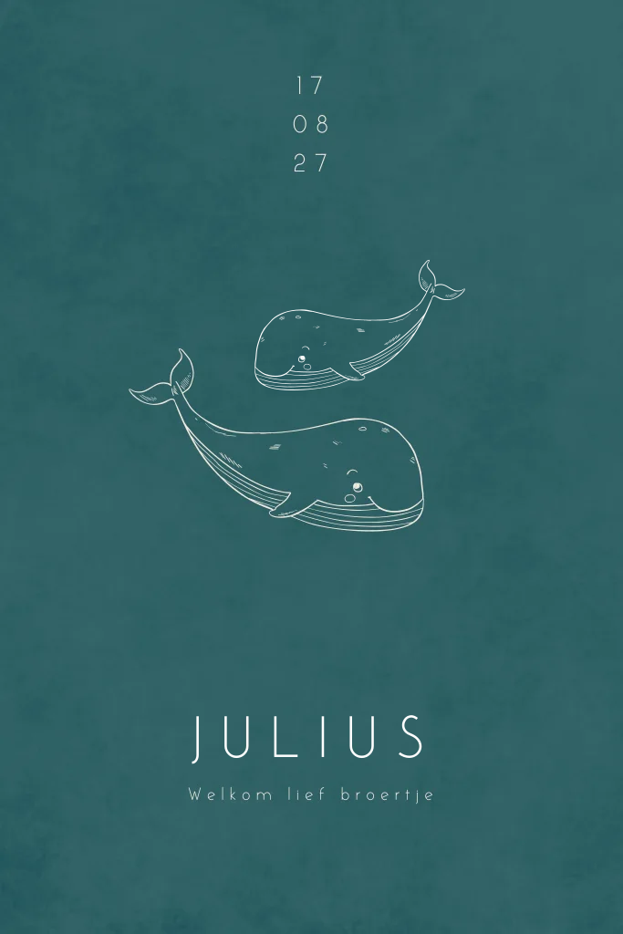 Jongens geboortekaartje met een lijntekening illustraties van walvissen. Dit kaartje Julius in onderwaterwereld thema heeft een blauwgrijze velvet / velours look achtergrond. De teksten en de lijntekening in het wit en luxe goudfolie komen hierop mooi naar voren. Pas dit babykaartje naar je eigen smaak aan in de editor.