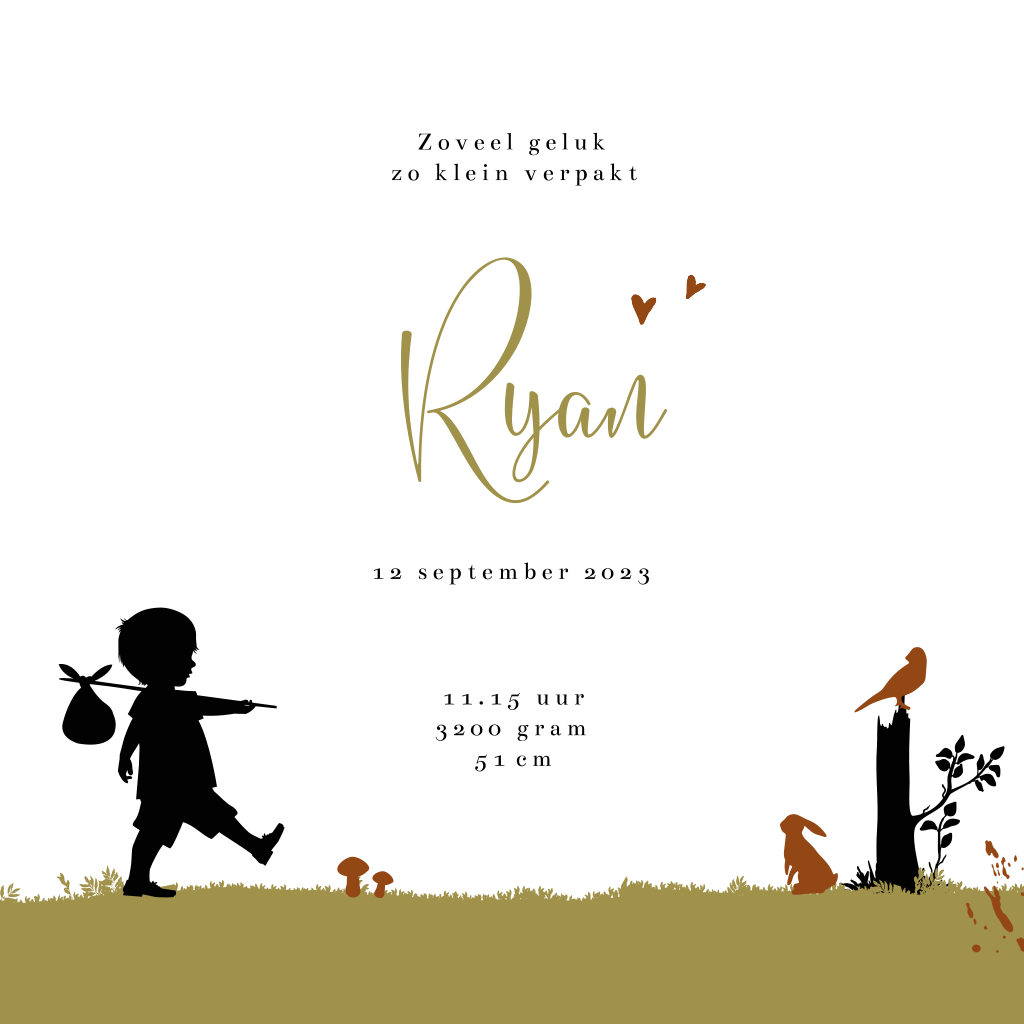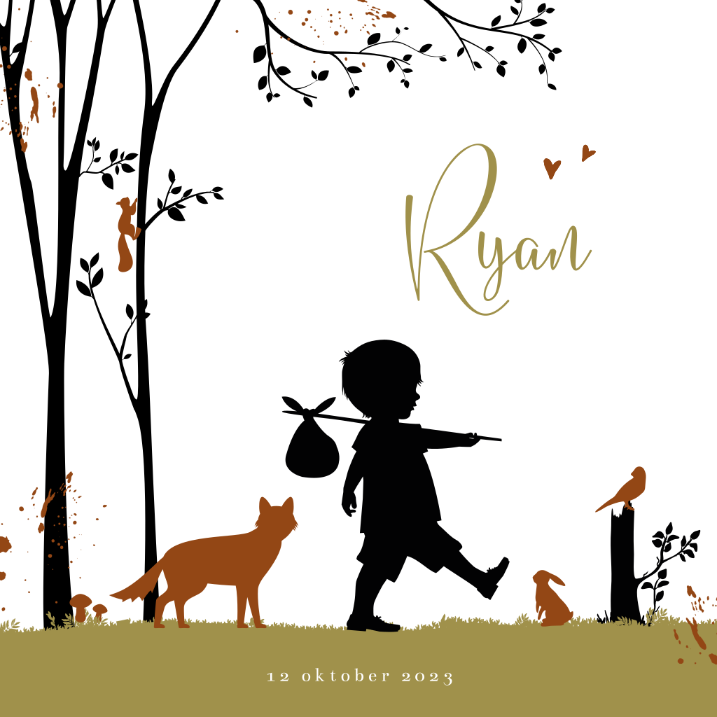 Herfst geboortekaartje met een klein jongetje met een knapzak die aan het wandelen is in het bos. Dit silhouet kaartje past perfect bij een kindje dat in de herfst geboren wordt. Dit kaartje Ryan heeft trendy herfstkleuren en afbeeldingen van een boom, vos, eekhoorn, paddenstoeltjes, een vogeltje en een konijntje. De teksten en kleuren zijn naar wens aan te passen. Ook mogelijk met een ander silhouet.